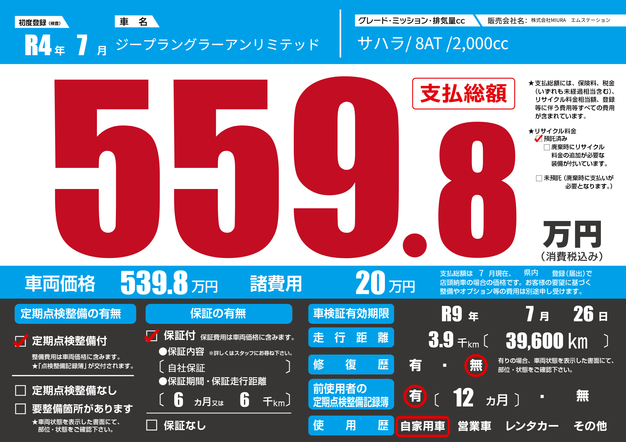 保証付き 保証内容(自社保証) 6ヶ月または6千km |