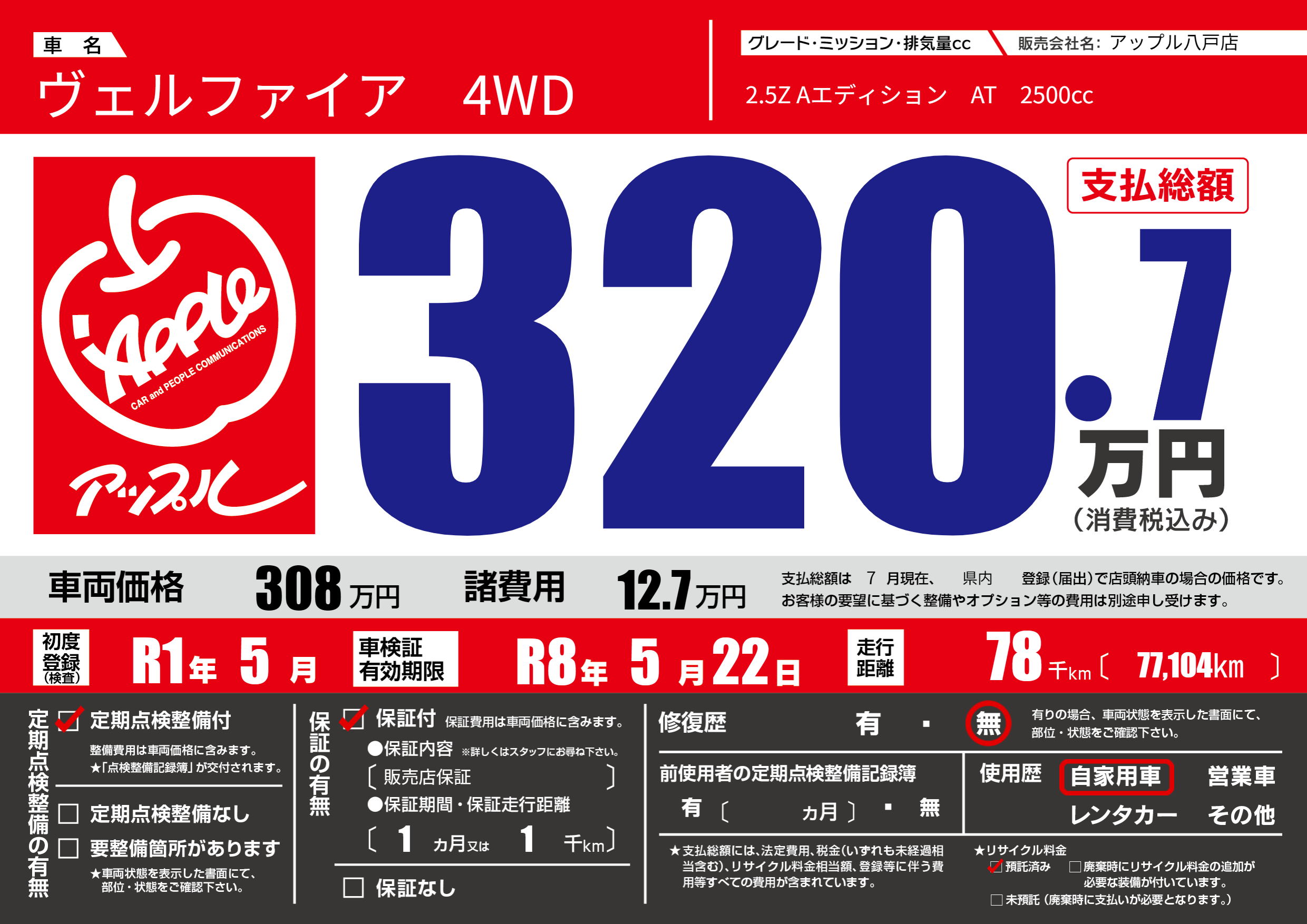 | 車名 | ヴェルファイア 4WD | グレード ミッション 排気量 |