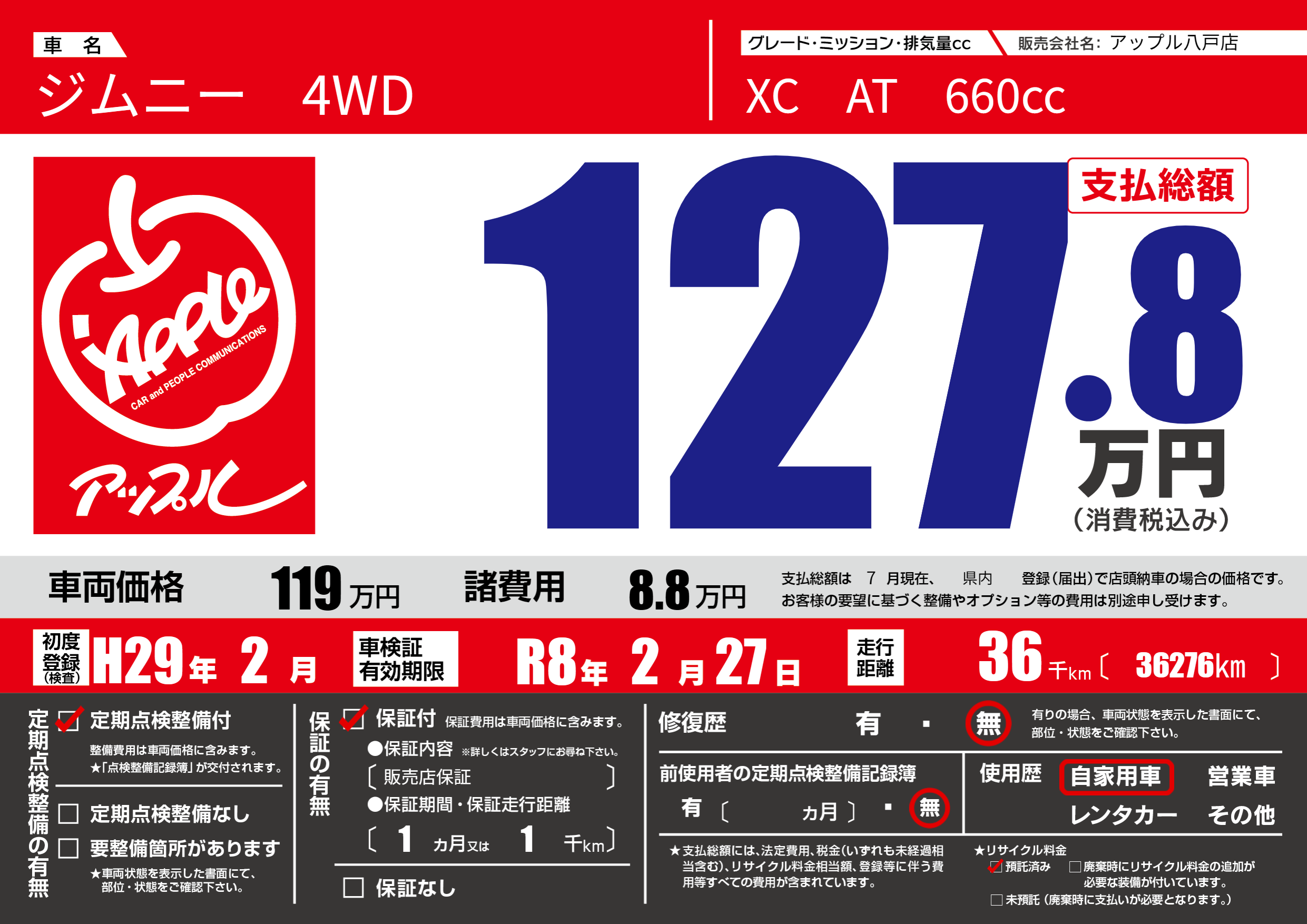 なし | 車検制限 | R8年2月27月 |