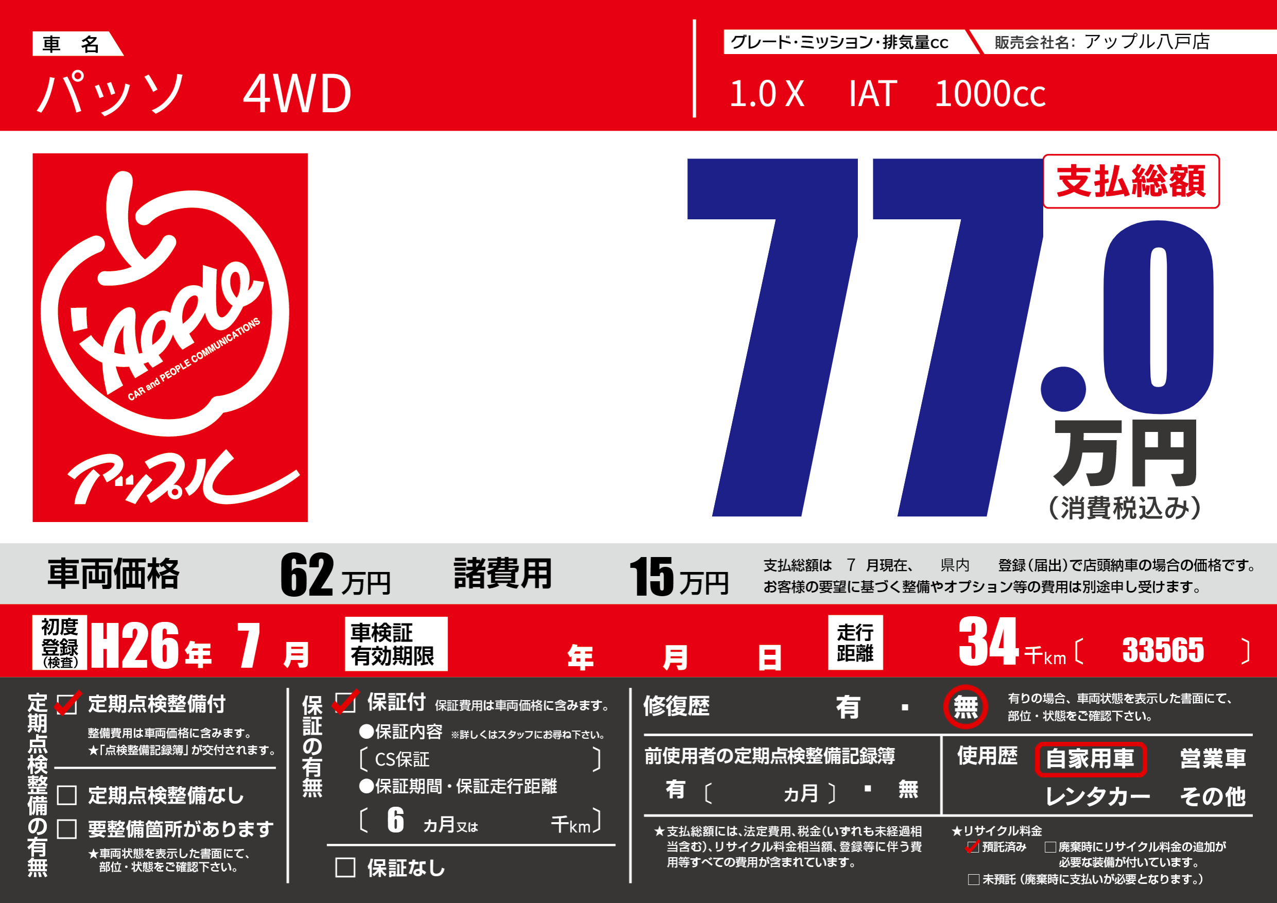 | 車名 | パッソ 4WD | グレード ミッション 排気量 |
