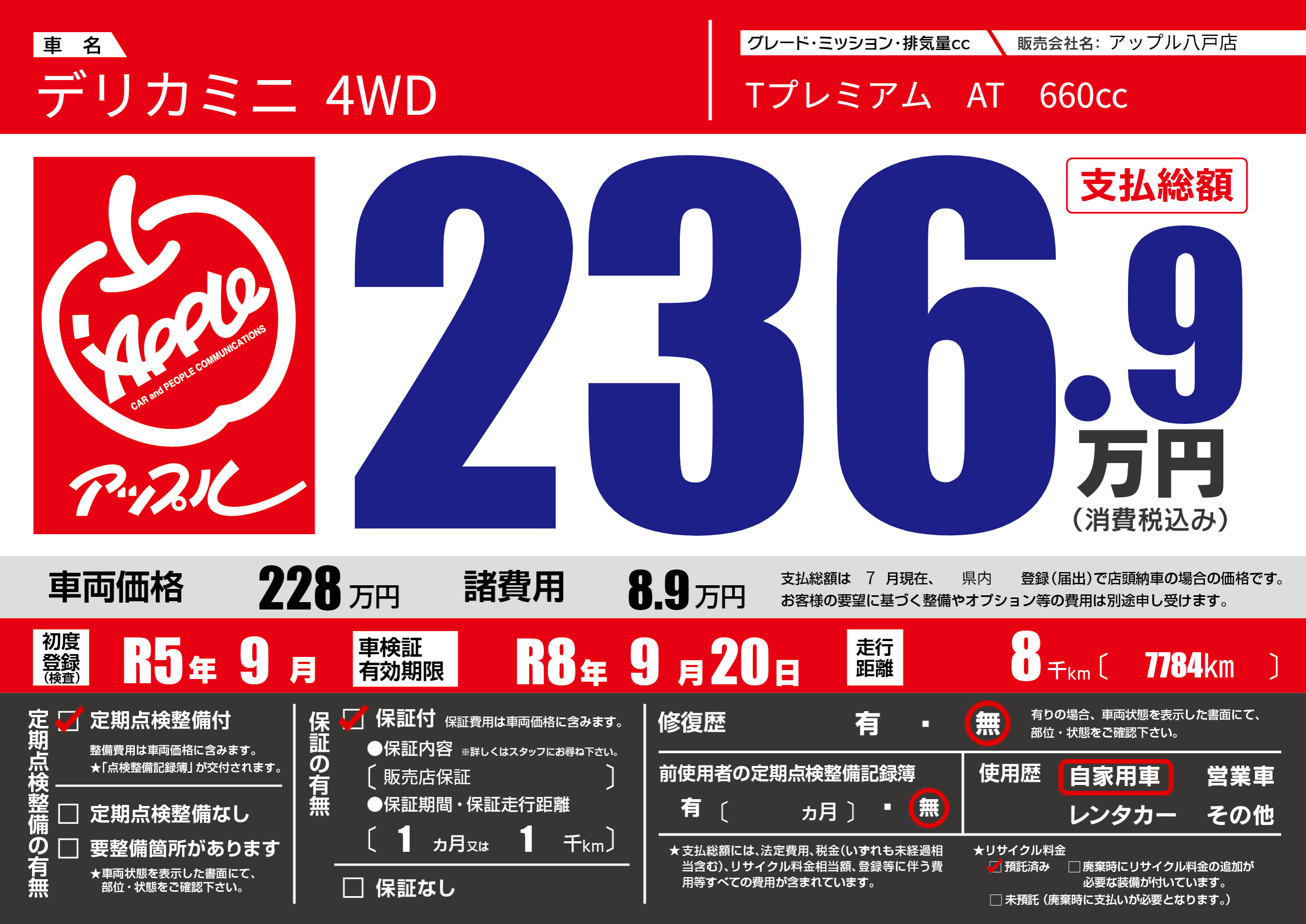 | 走行キロ | 0.8万km | 初年度登録 | R5年9月 |