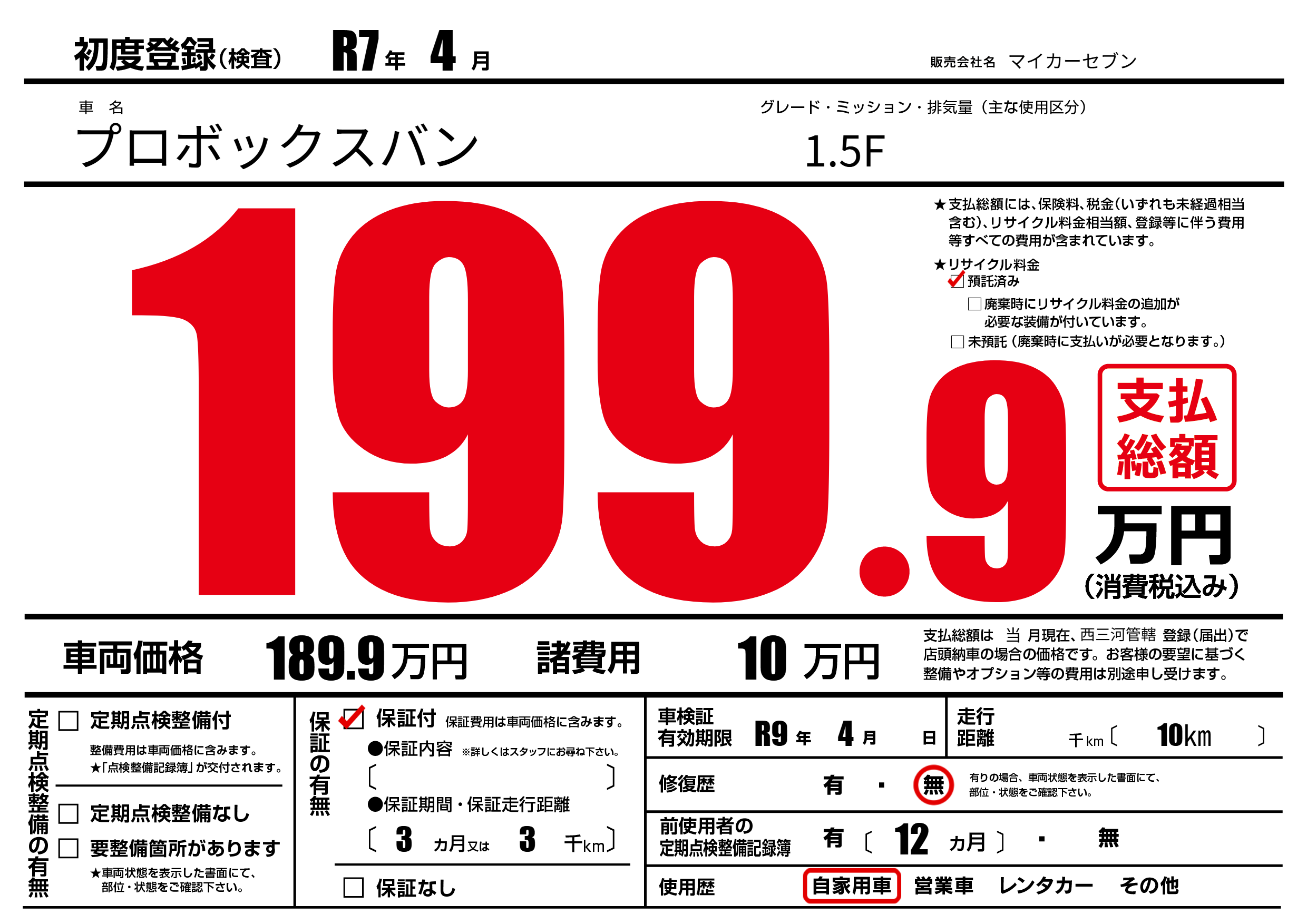 | 車名 | プロボックスバン | グレード ミッション 排気量 |
