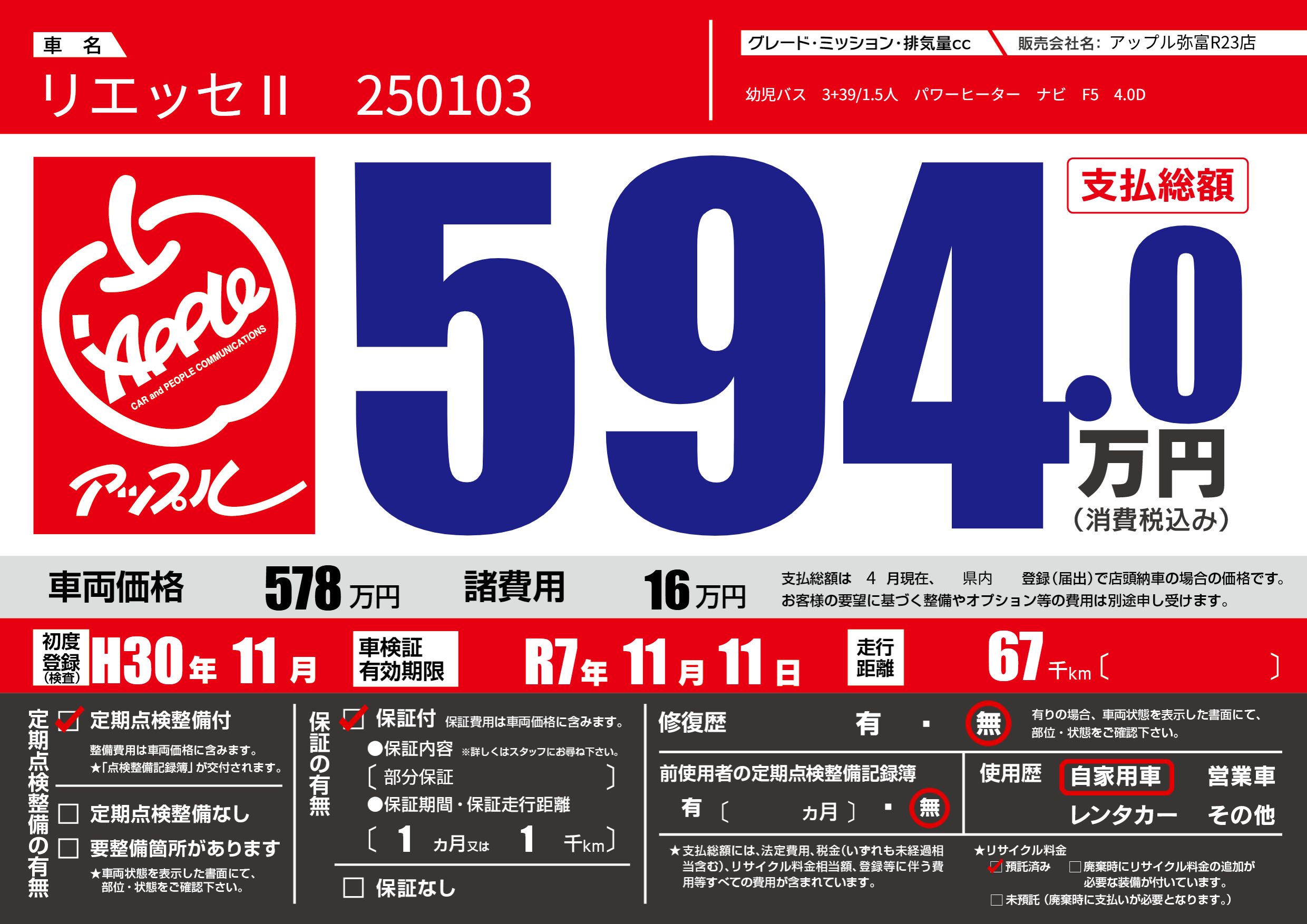 | 車名 | リエッセⅡ 250103 | グレード ミッション 排気量 |