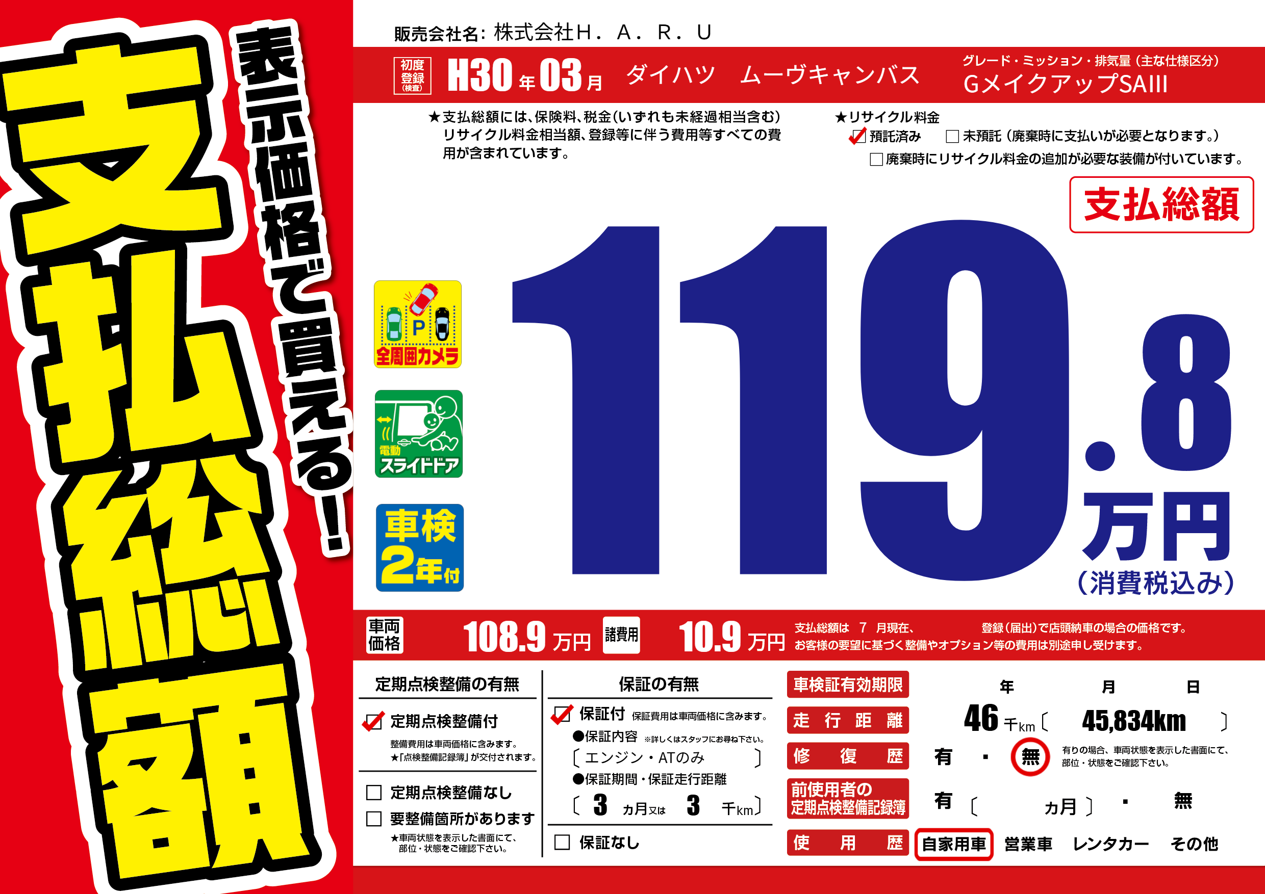 | 走行キロ | 4.6万km | 初年度登録 | H30年03月 |