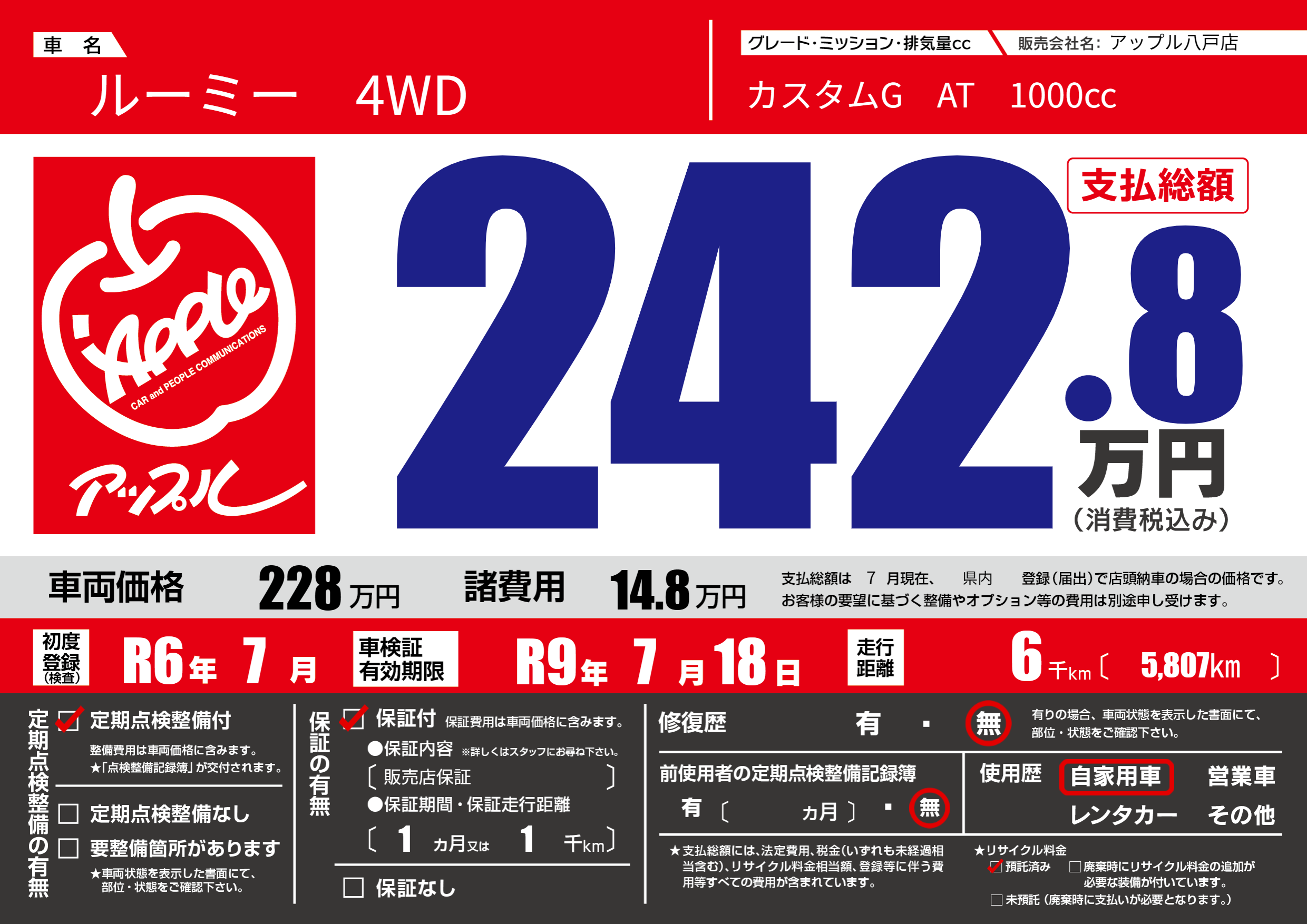 | 走行キロ | 0.6万km | 初年度登録 | R6年7月 |