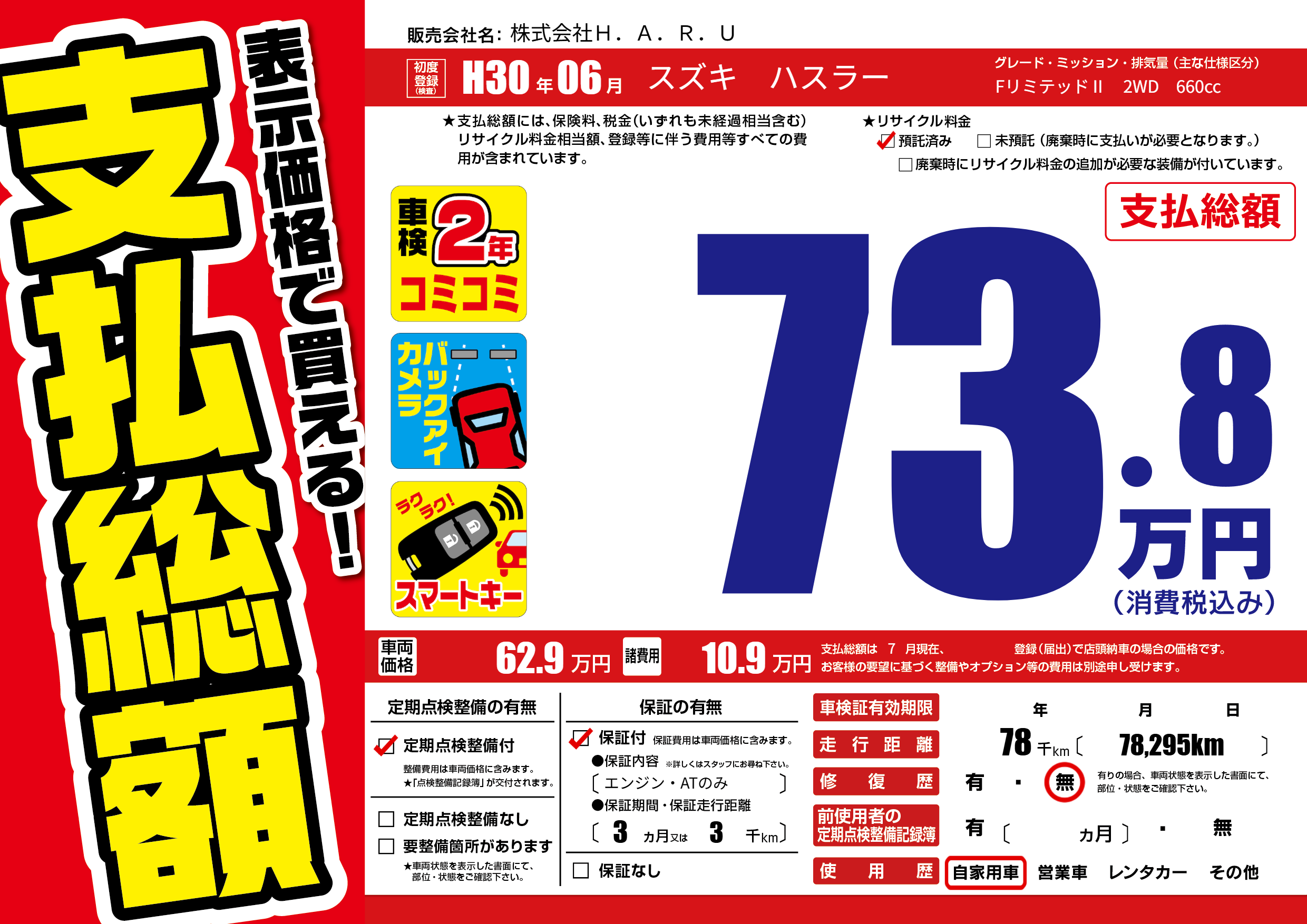 | 走行キロ | 7.8万km | 初年度登録 | H30年06月 |