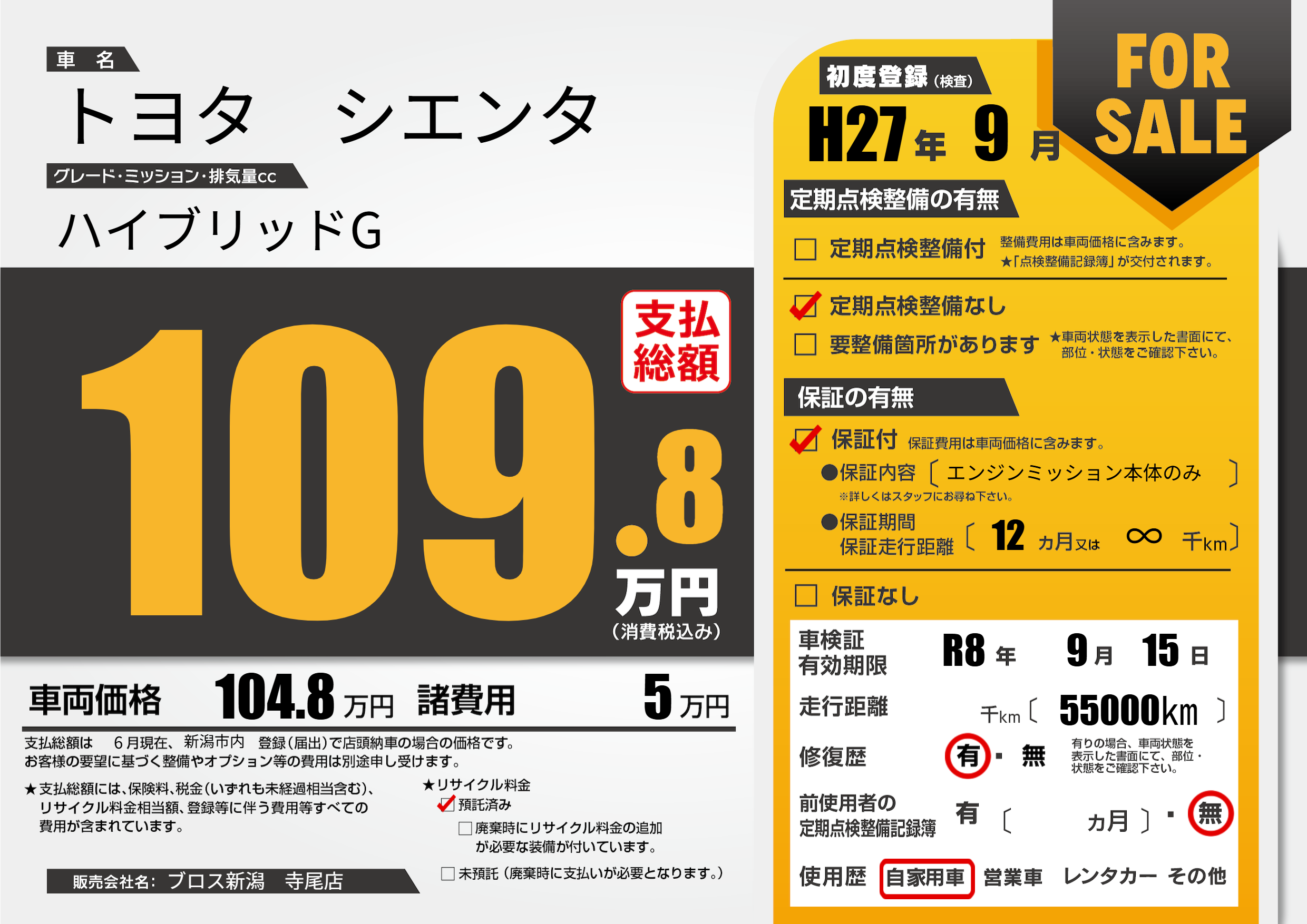 | 車名 | トヨタ シエンタ | グレード ミッション 排気量 |