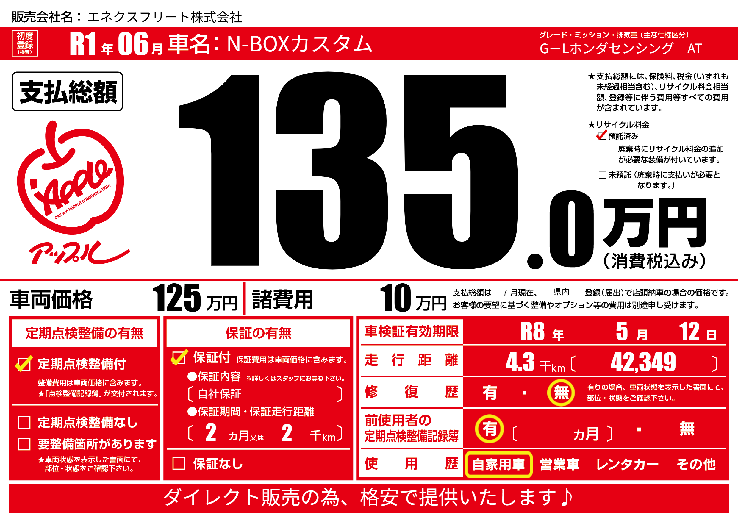 | 走行キロ | 0.4万km | 初年度登録 | R1年06月 |