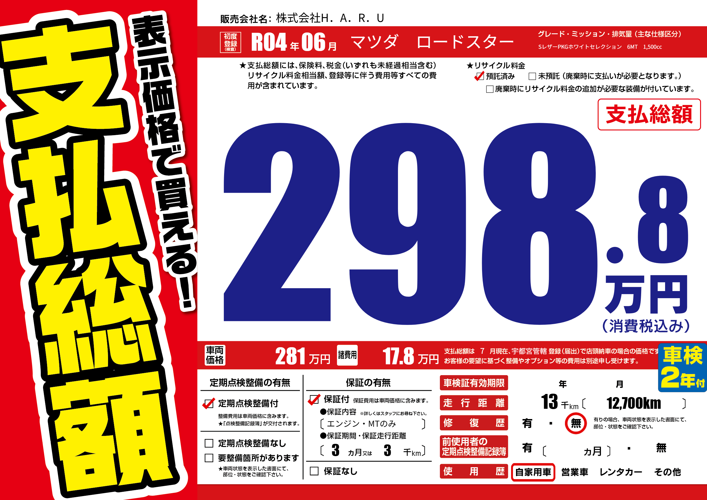 | 車名 | マツダ ロードスター | グレード ミッション 排気量 |