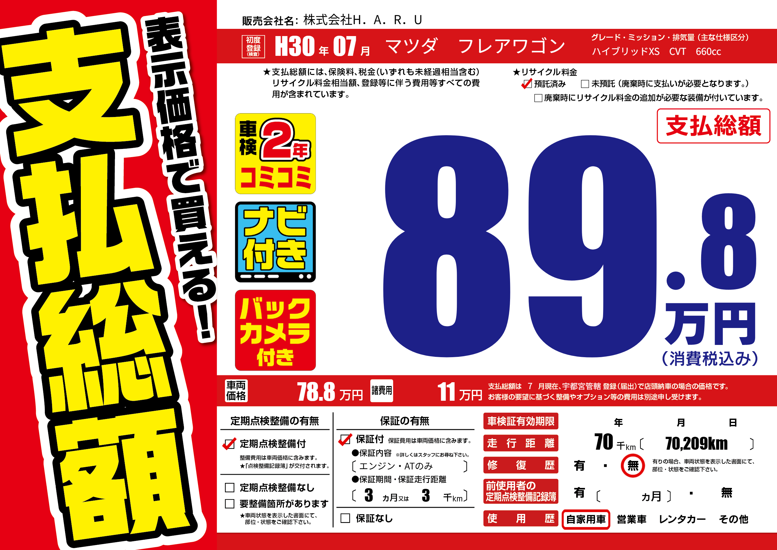 | 走行キロ | 7万km | 初年度登録 | H30年07月 |
