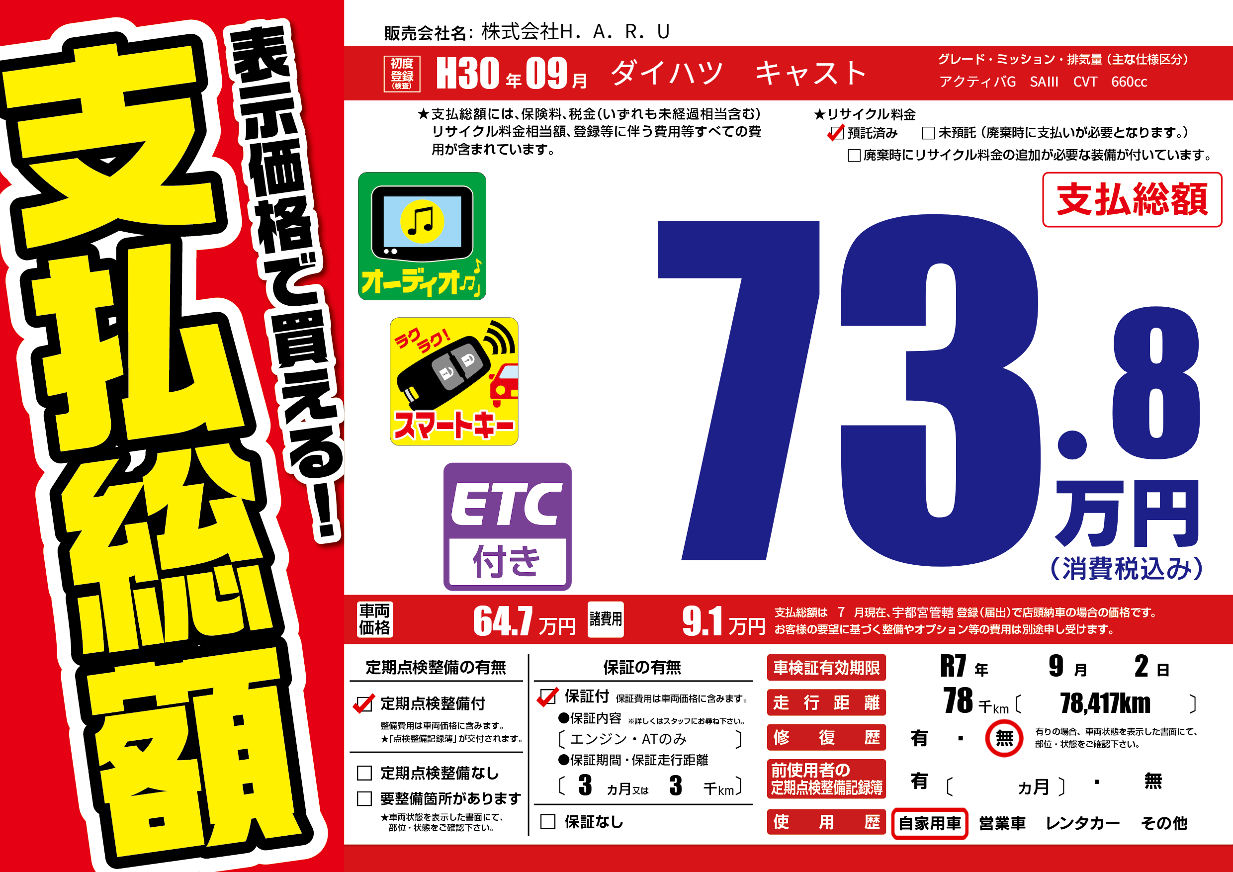 | 車名 | ダイハツ キャスト | グレード ミッション 排気量 |
