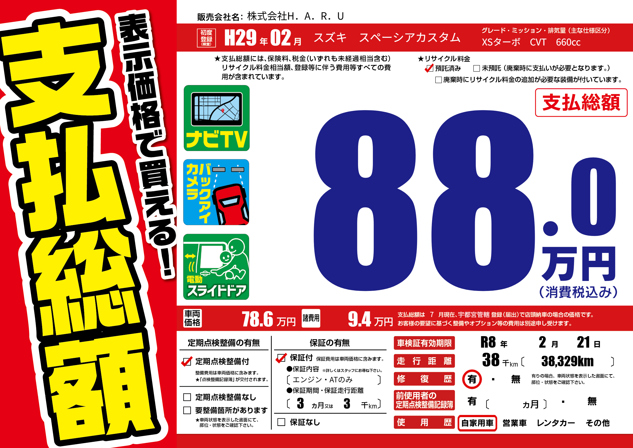 | 走行キロ | 3.8万km | 初年度登録 | H29年02月 |