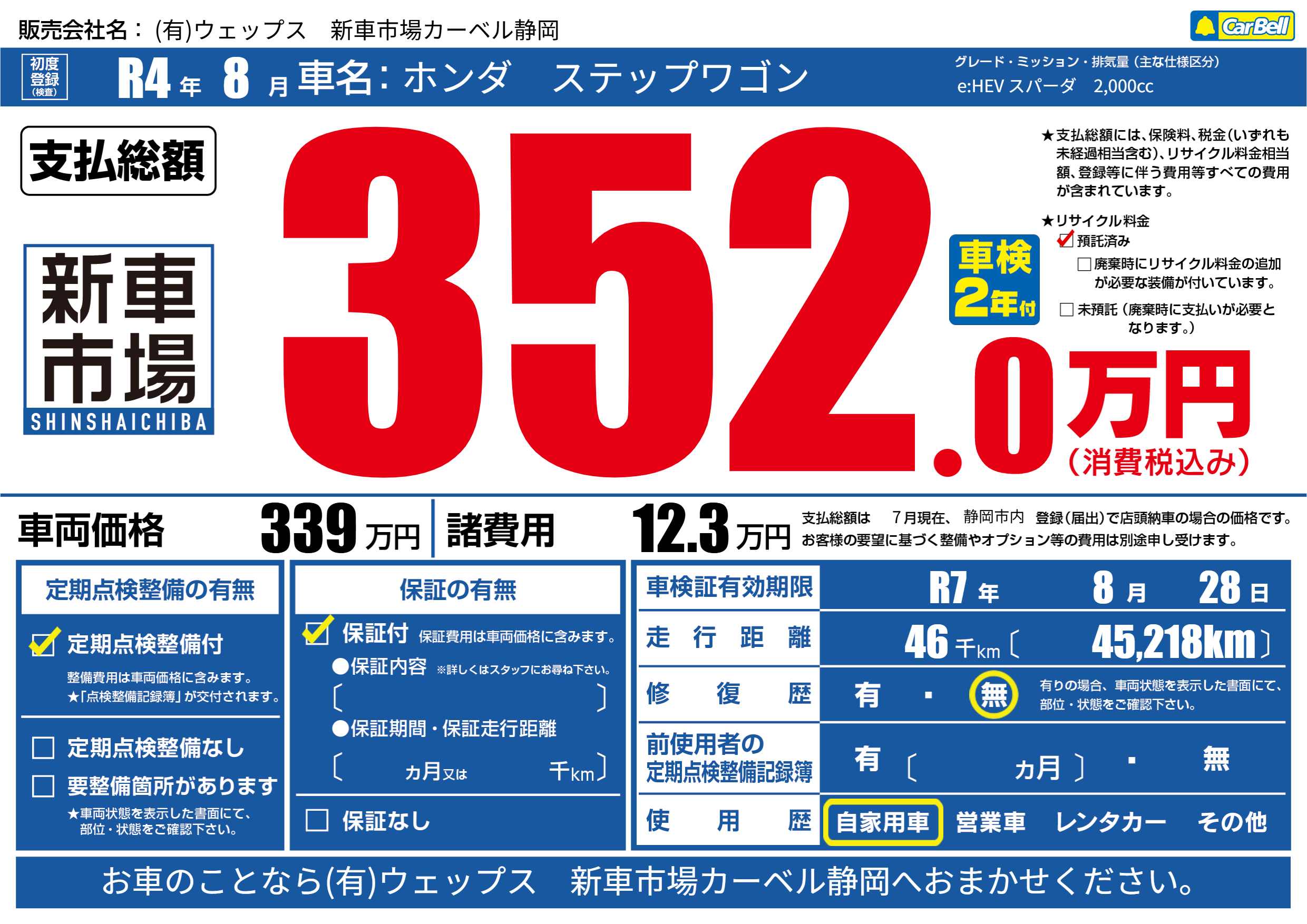 | 車名 | ホンダ ステップワゴン | グレード ミッション 排気量 |