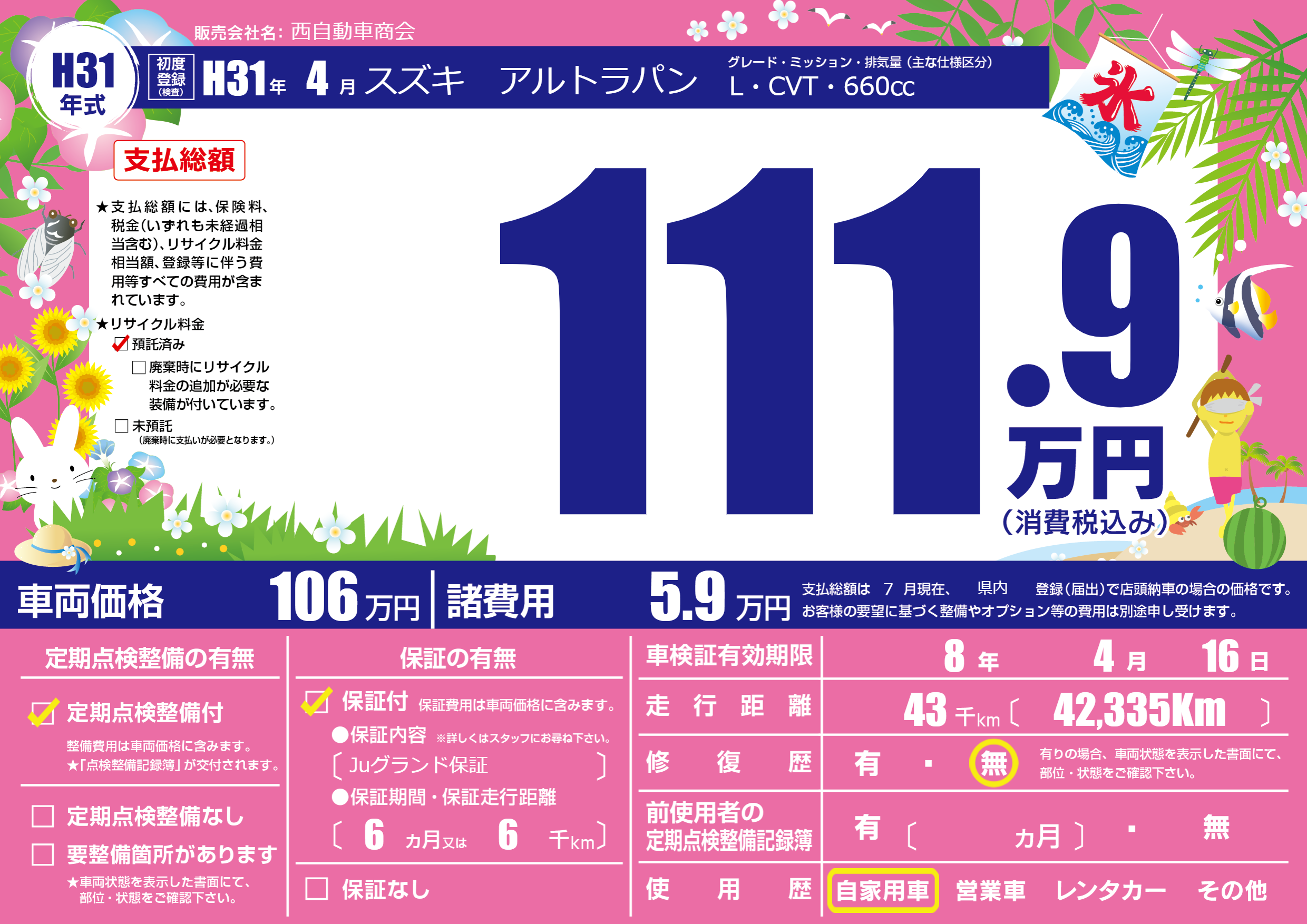 | 走行キロ | 4.3万km | 初年度登録 | H31年4月 |