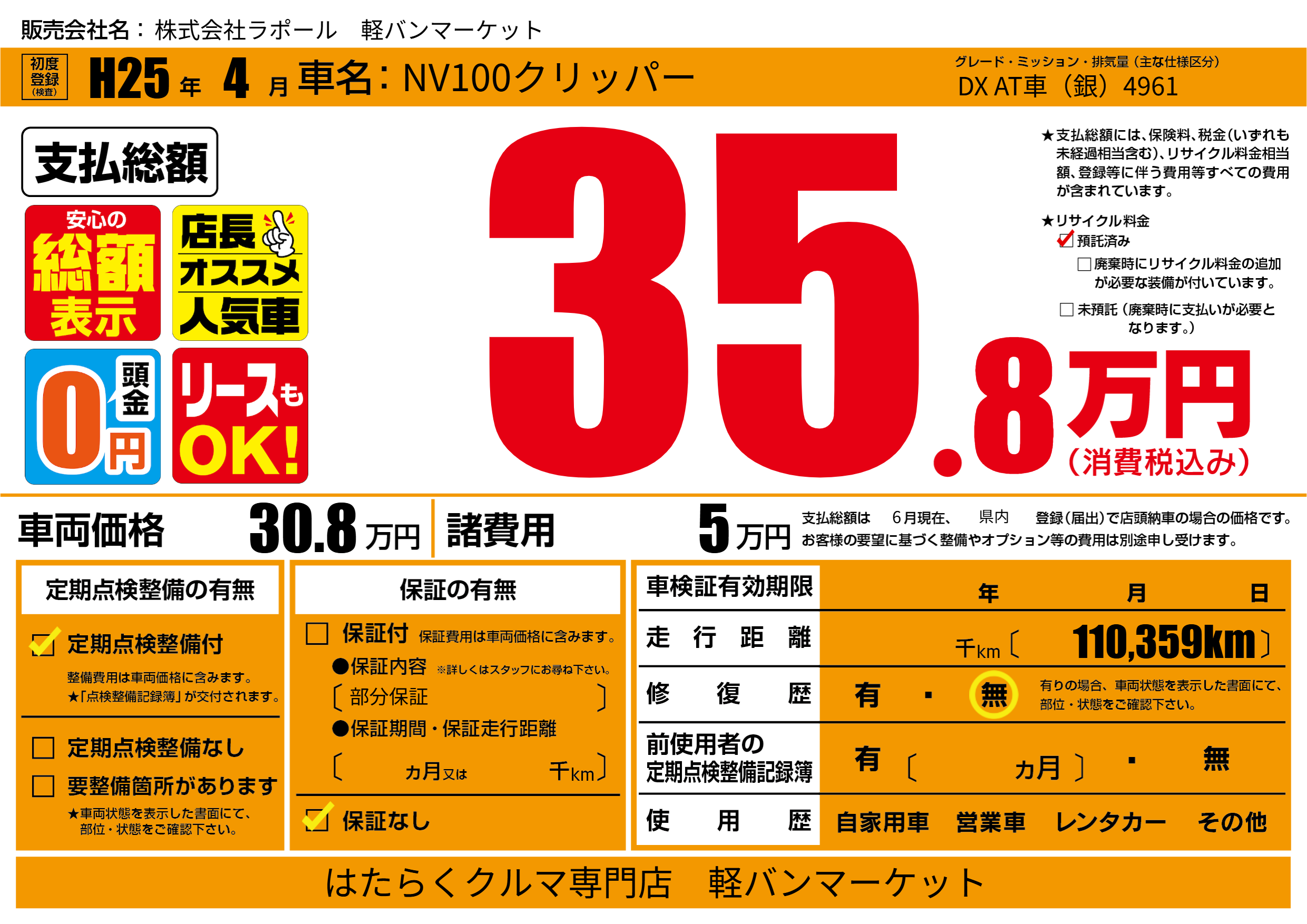 | 車名 | NV100クリッパー | グレード ミッション 排気量 |
