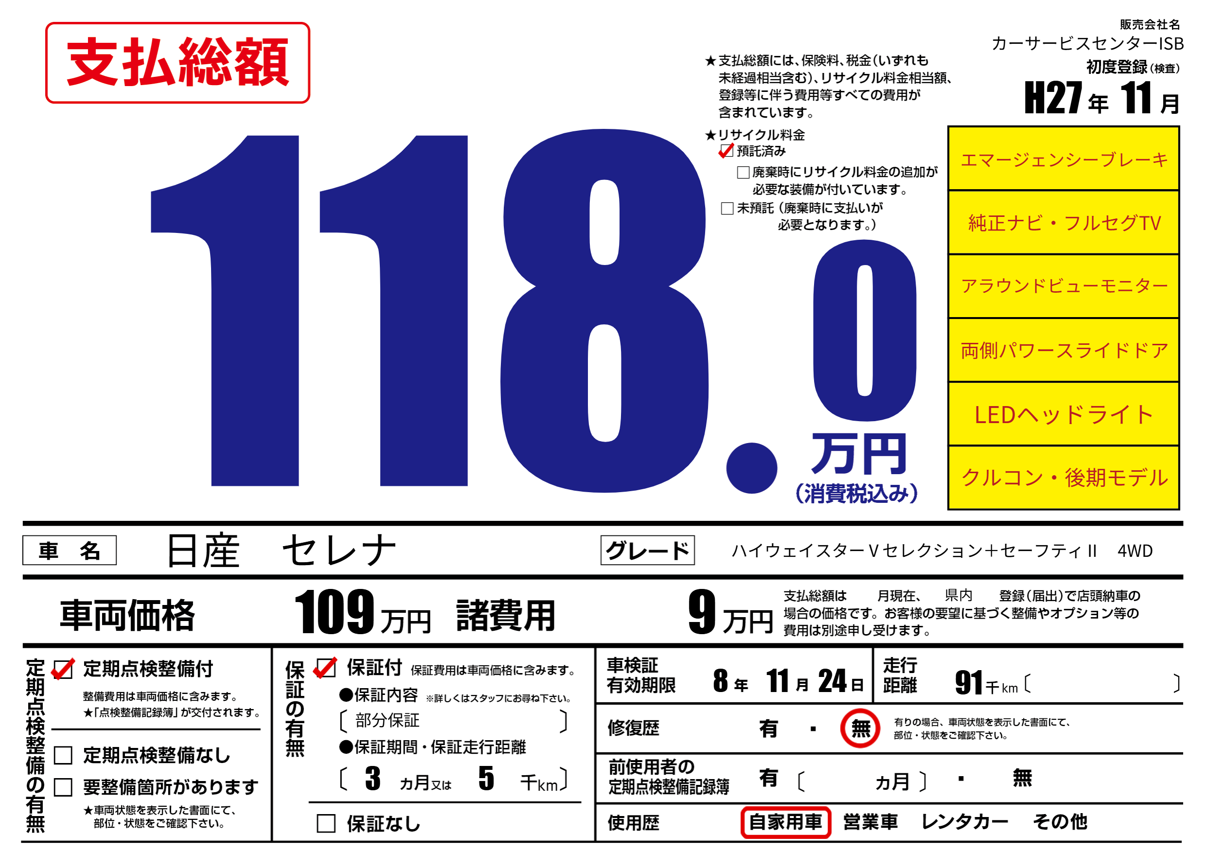 | 走行キロ | 9.1万km | 初年度登録 | H27年11月 |