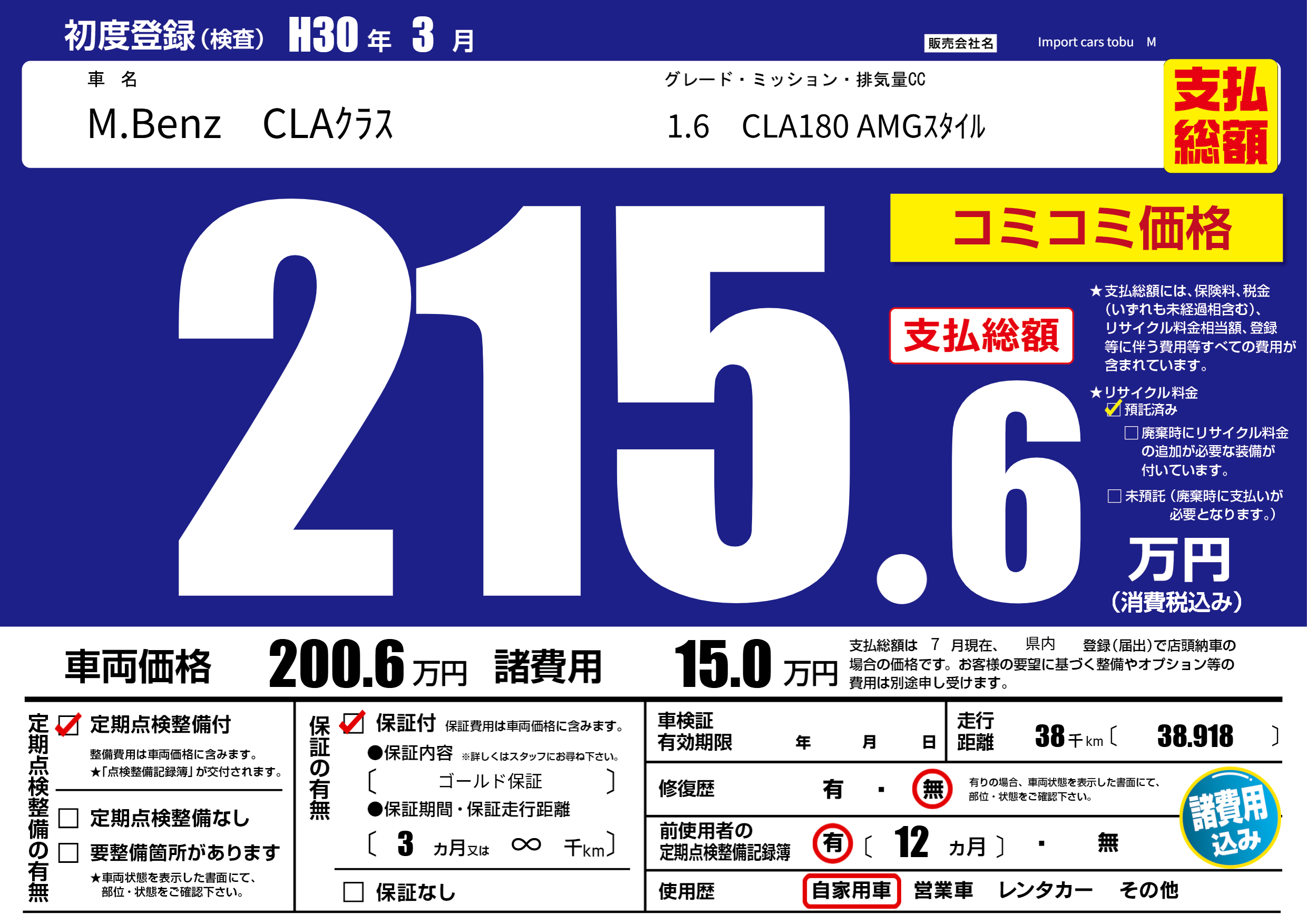 | 車名 | M.Benz CLAクラス | グレード ミッション 排気量 |