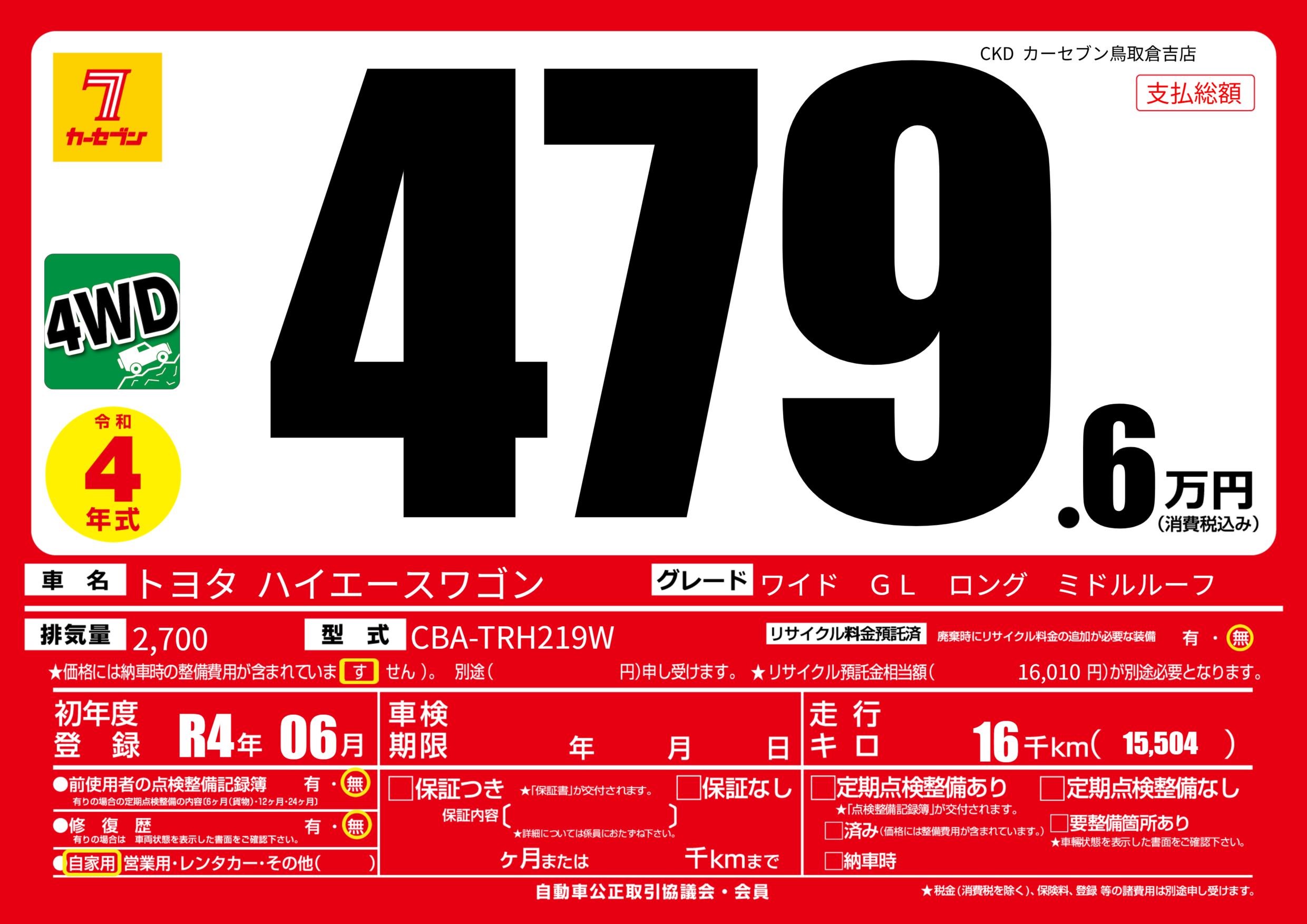 | 走行キロ | 1.6万km | 初年度登録 | R4年06月 |