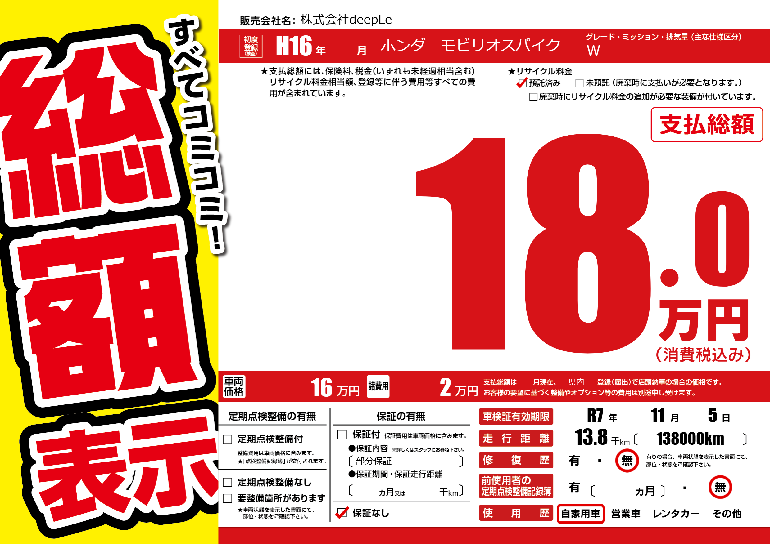 | 車名 | ホンダ モビリオスパイク | グレード ミッション 排気量 |