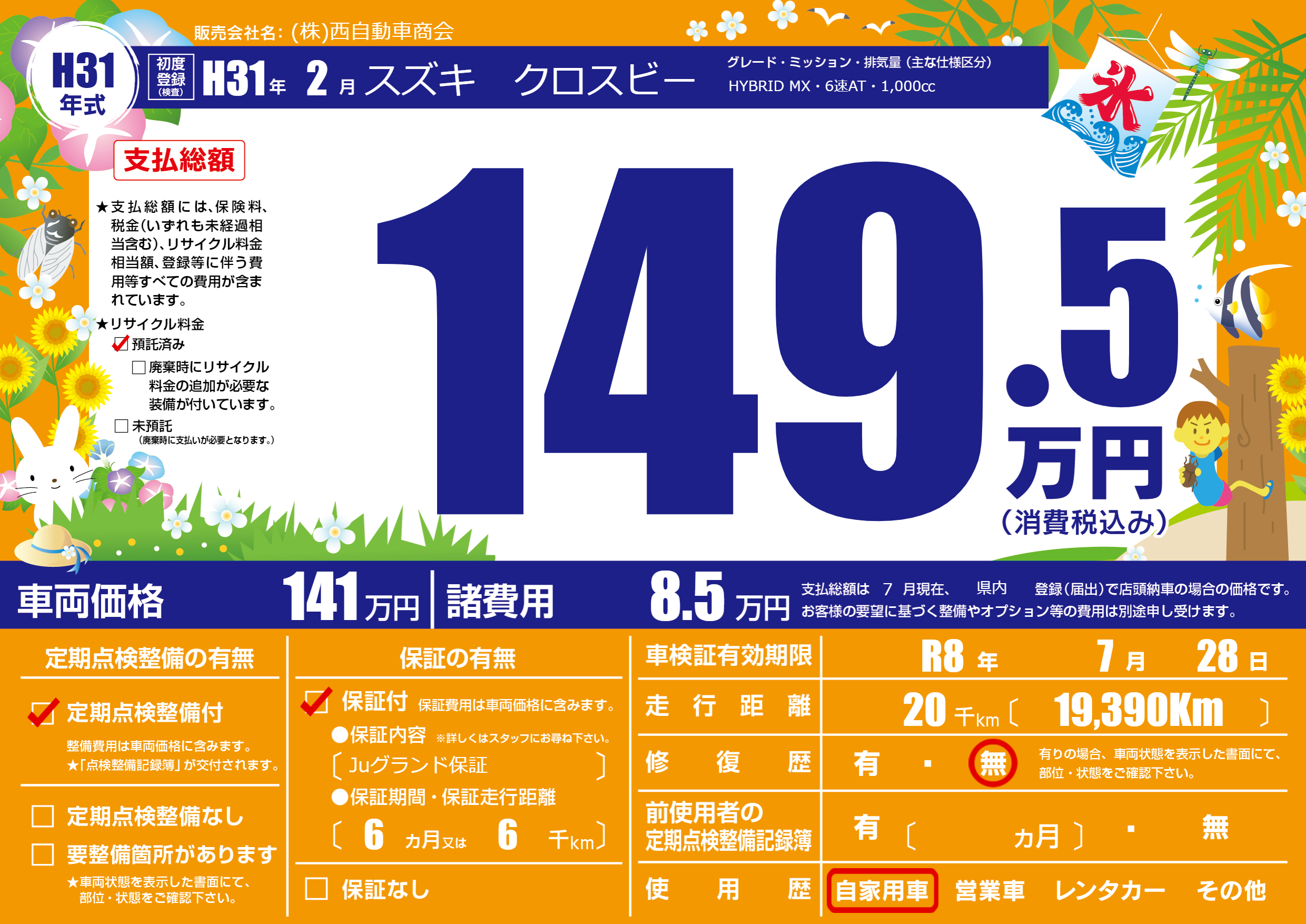 | 走行キロ | 2万km | 初年度登録 | H31年2月 |