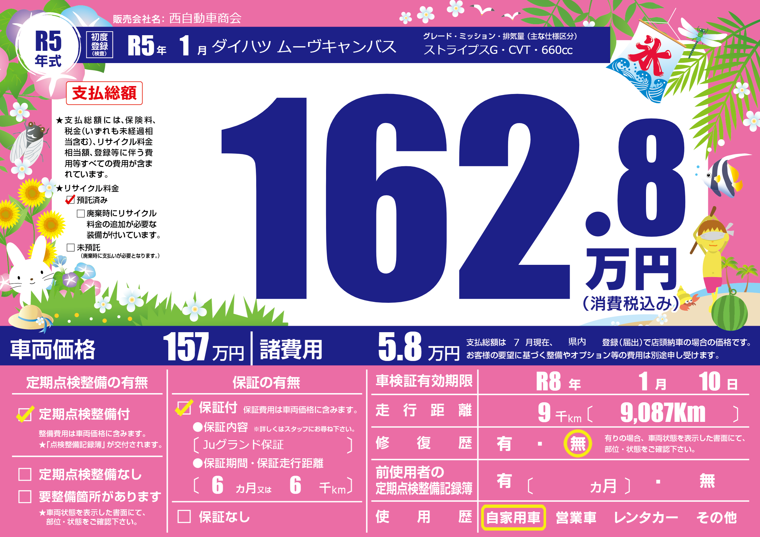 | 走行キロ | 0.9万km | 初年度登録 | R5年1月 |