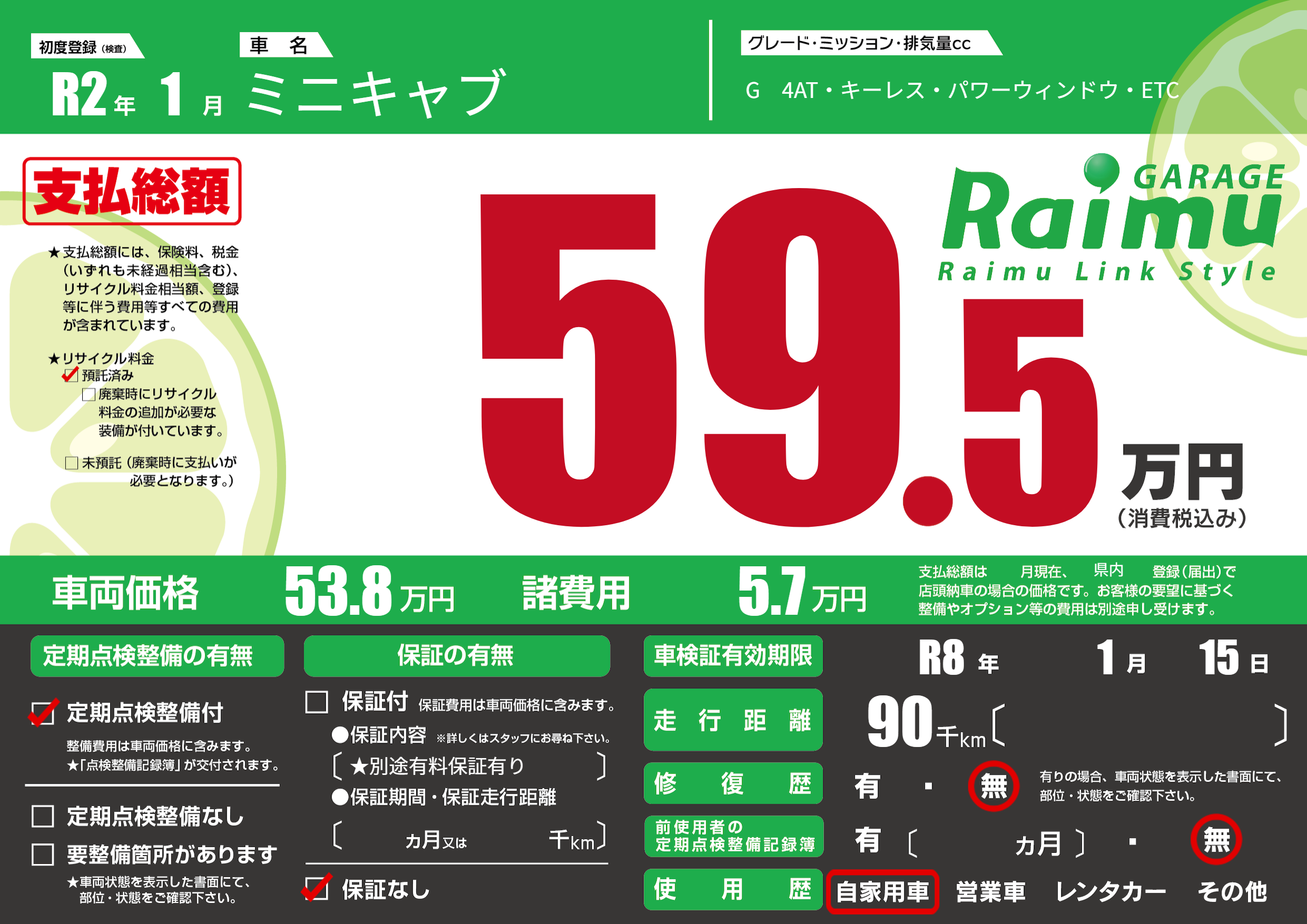 | 車名 | ミニキャブ | グレード ミッション 排気量 |