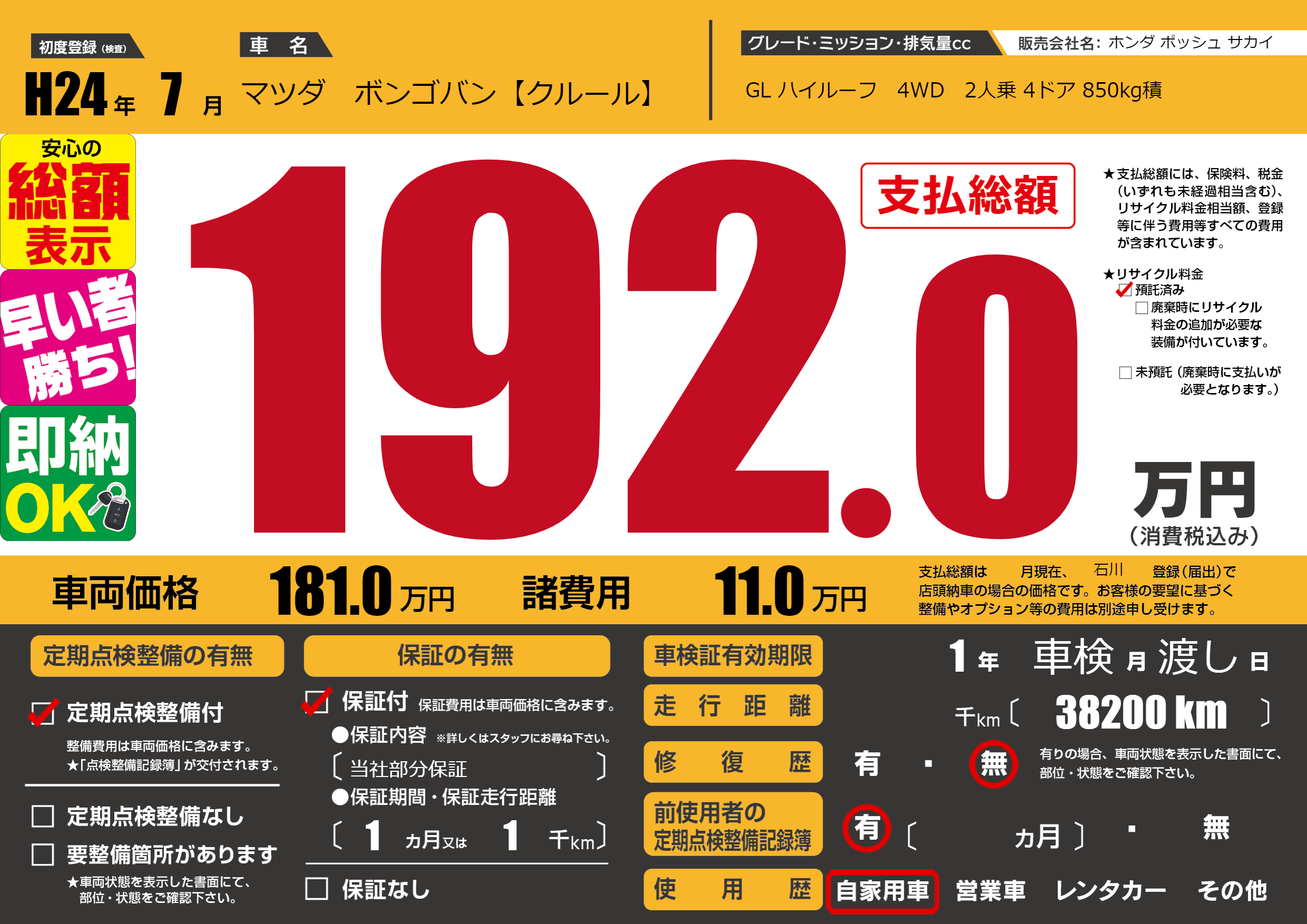 | 車名 | マツダ ボンゴバン【クルール】 | グレード ミッション 排気量 |