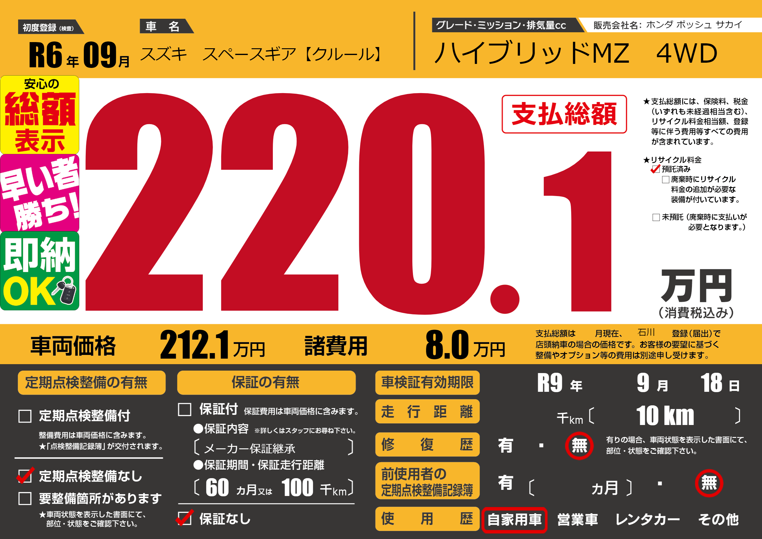 | 走行キロ | - | 初年度登録 | R6年09月 |