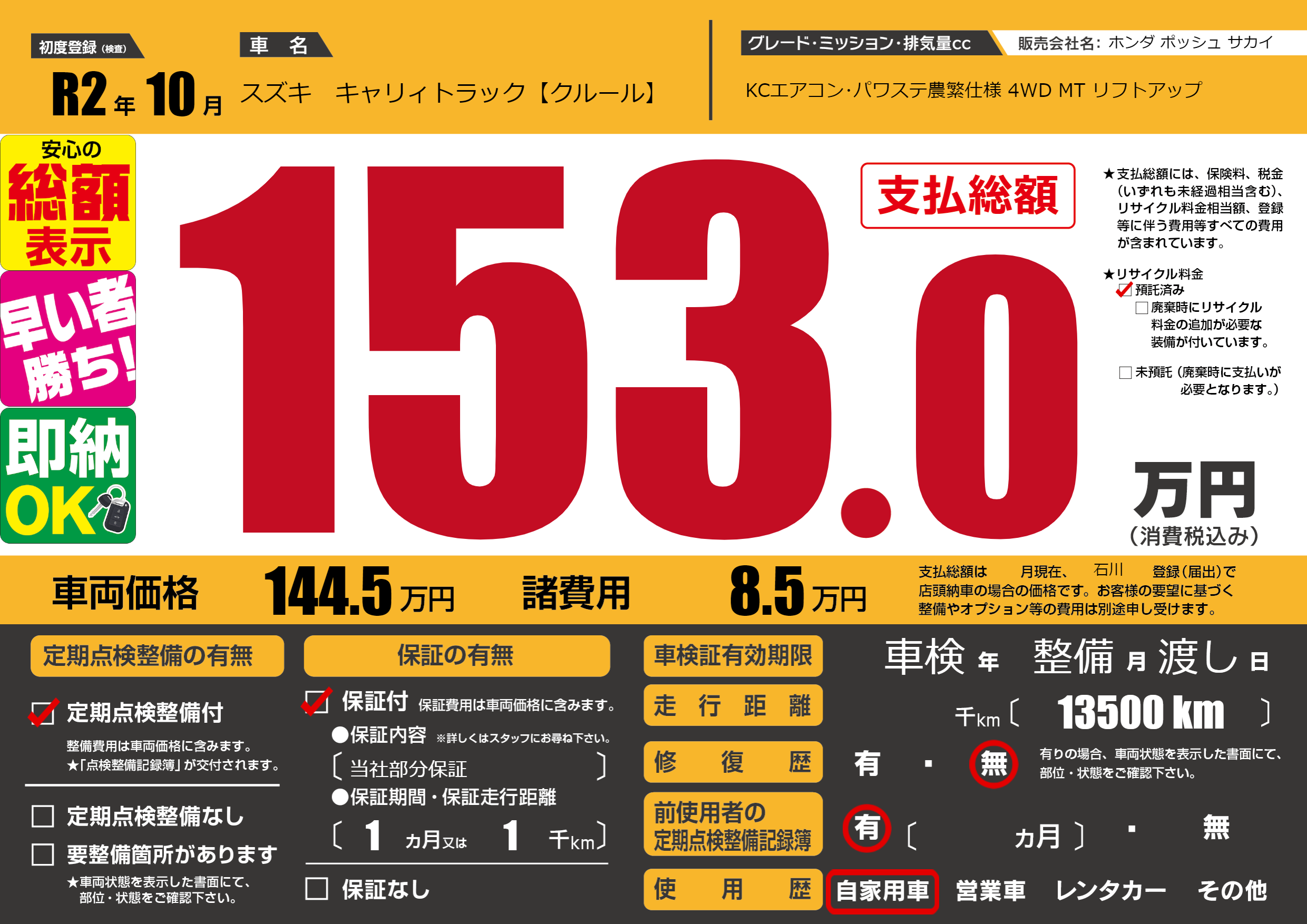 | 走行キロ | - | 初年度登録 | R2年10月 |