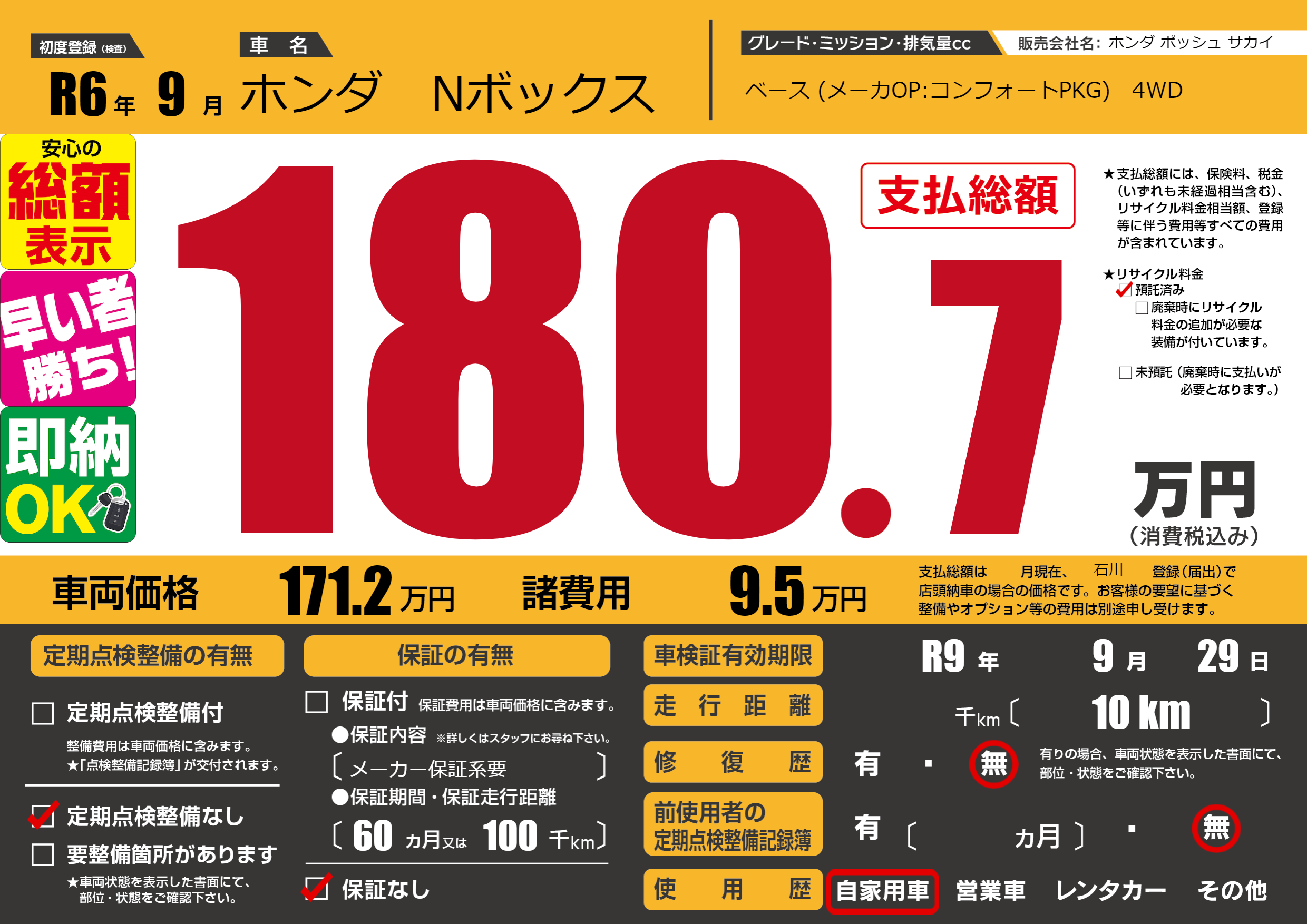 | 走行キロ | - | 初年度登録 | R6年9月 |