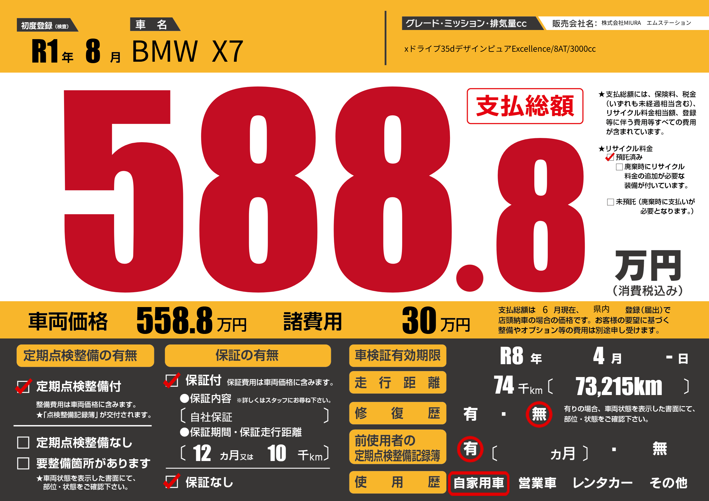 | 車名 | BMW X7 | グレード ミッション 排気量 |