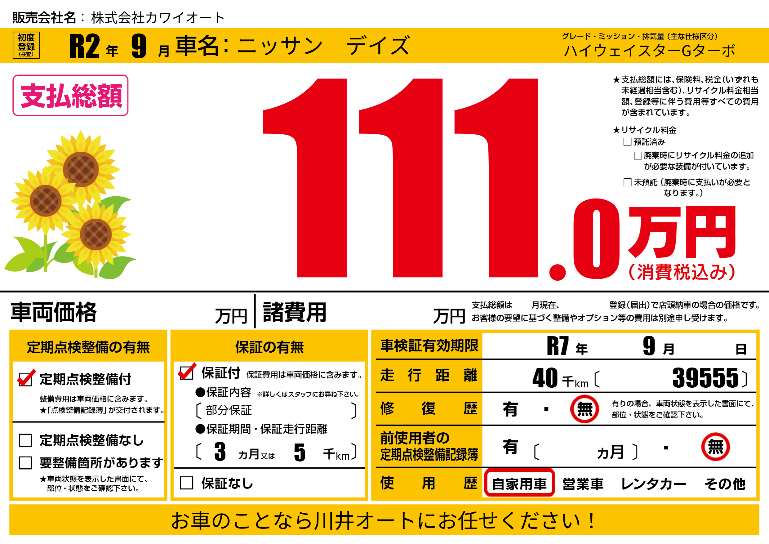 保証付き 保証内容(部分保証) 3ヶ月または(5)千kmまで |