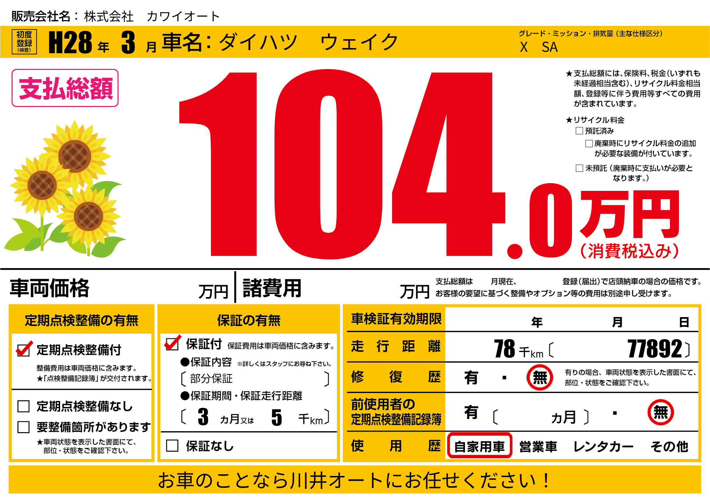 | 走行キロ | 7.8万km | 初年度登録 | H28年3月 |