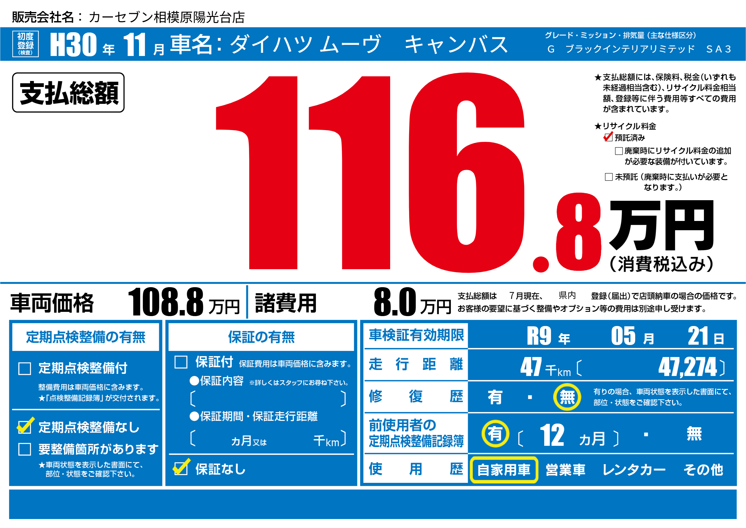 | 車検制限 | R9年 05月 21日 | ||