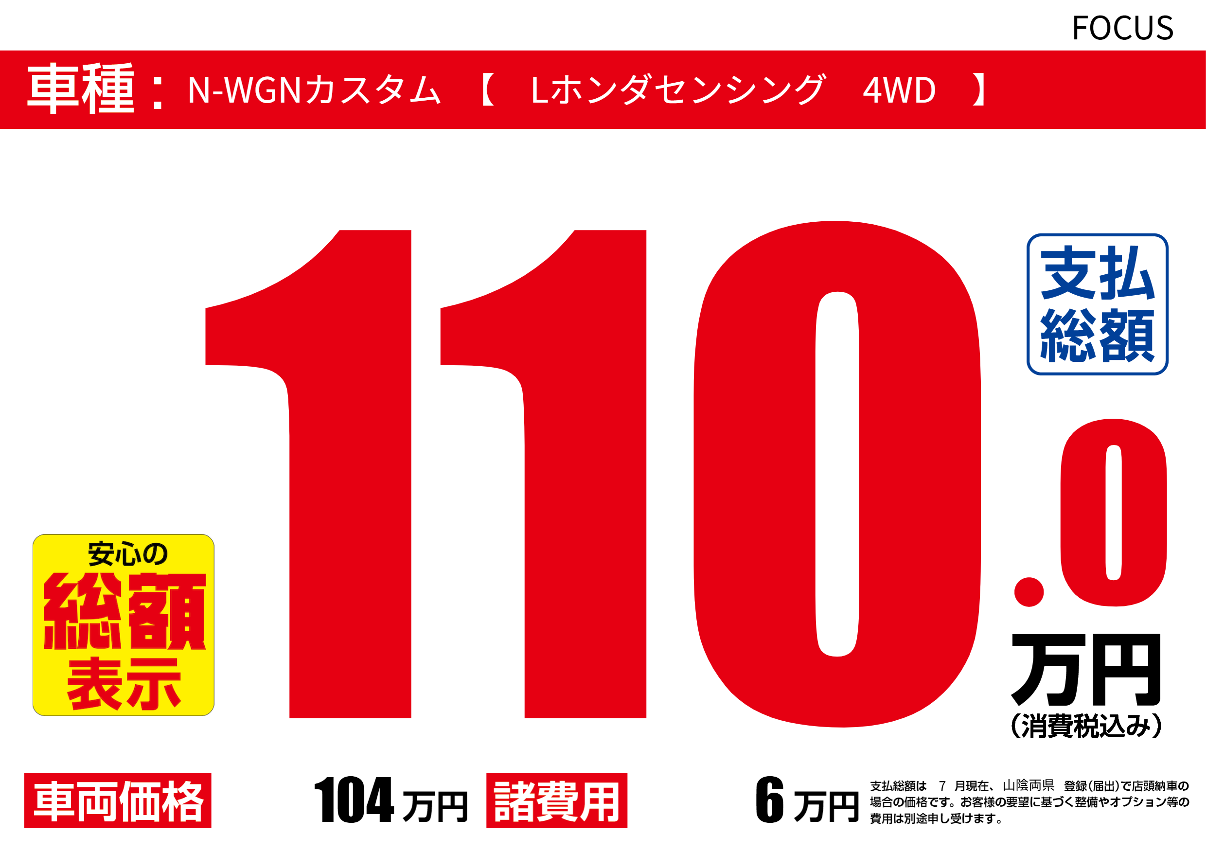 | 車名 | N-WGNカスタム 【 Lホンダセンシング 4WD 】 | グレード ミッション 排気量 |