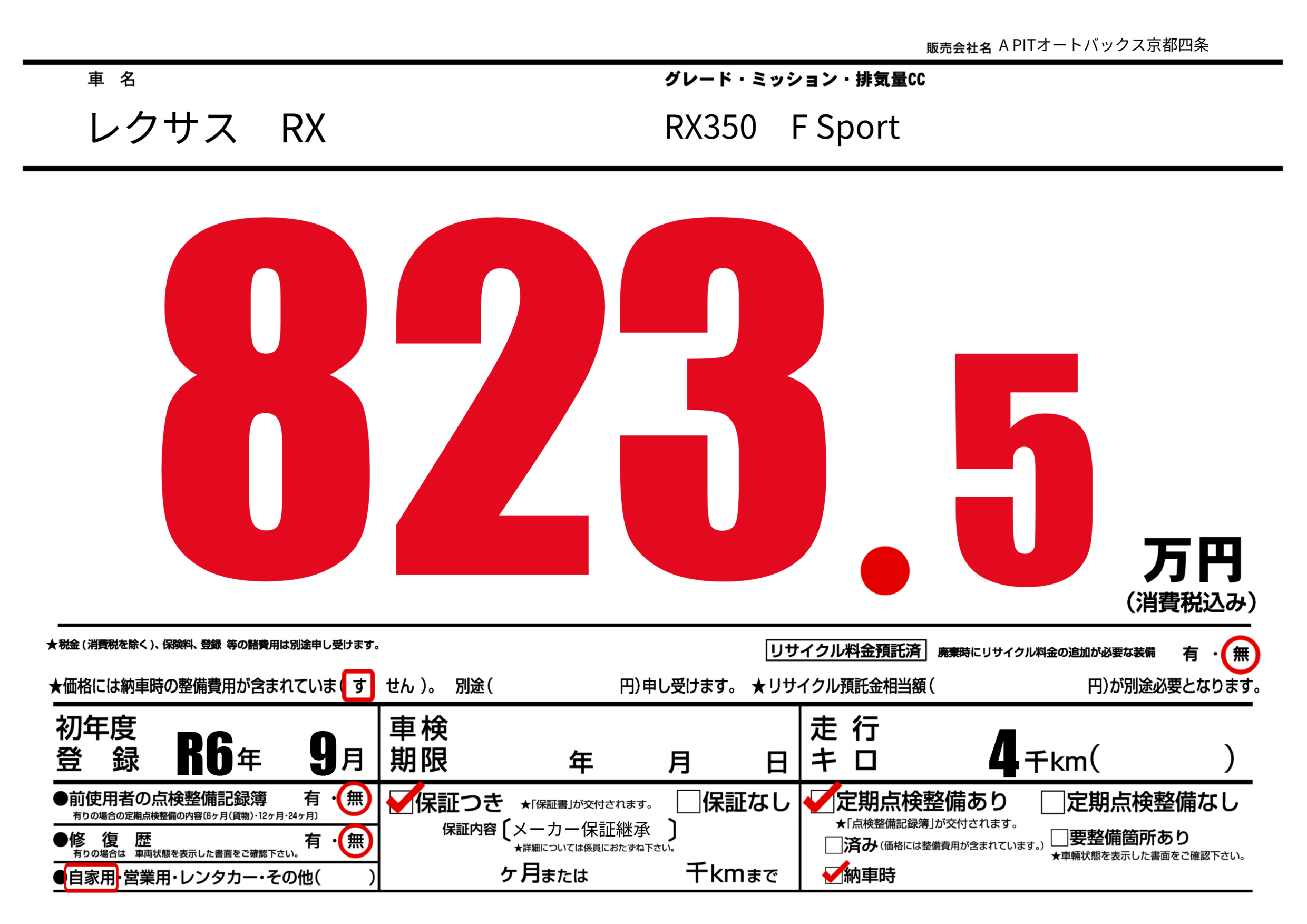 | 走行キロ | 0.4万km | 初年度登録 | R6年9月 |