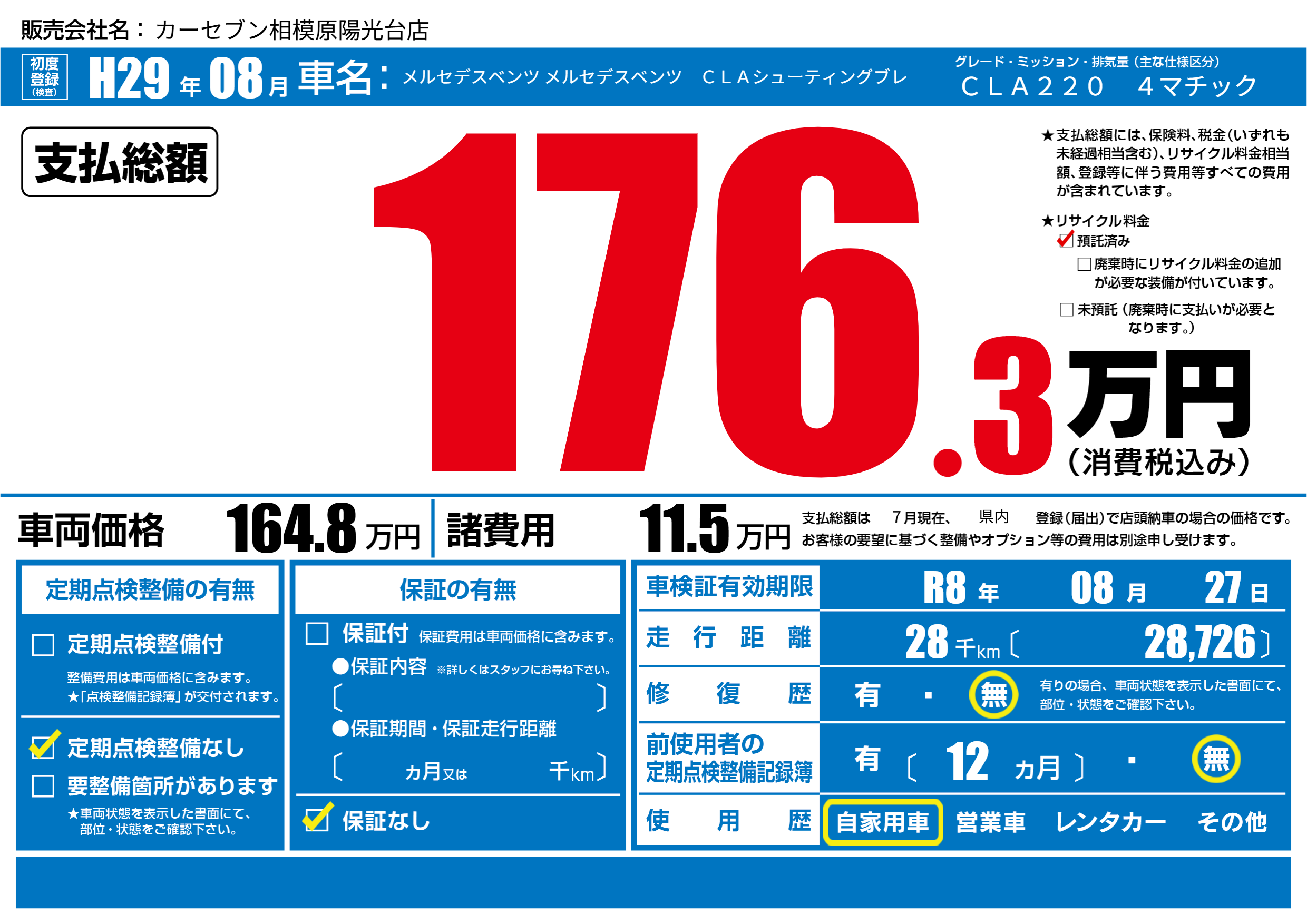 | 車検制限 | R8年 08月 27日 | ||
