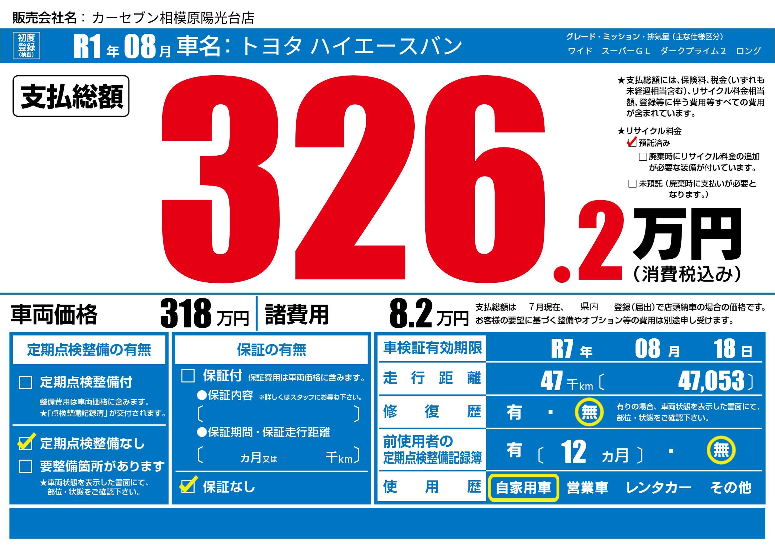 | 走行キロ | 4.7万km | 初年度登録 | R1年08月 |
