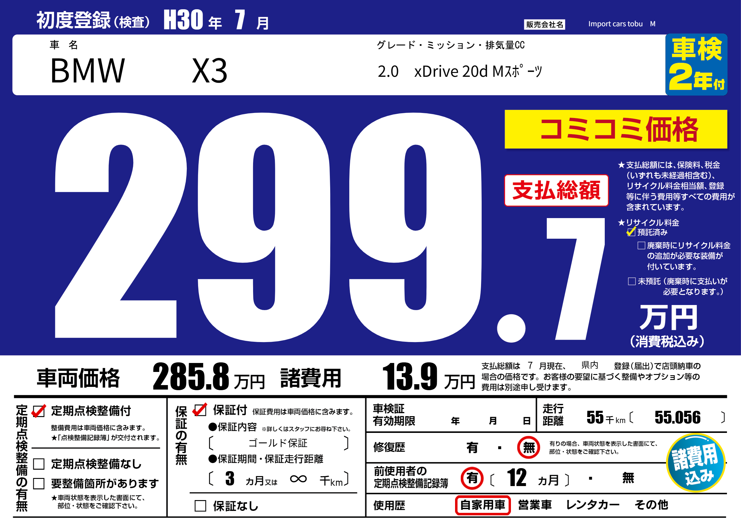 | 車名 | BMW X3 | グレード ミッション 排気量 |