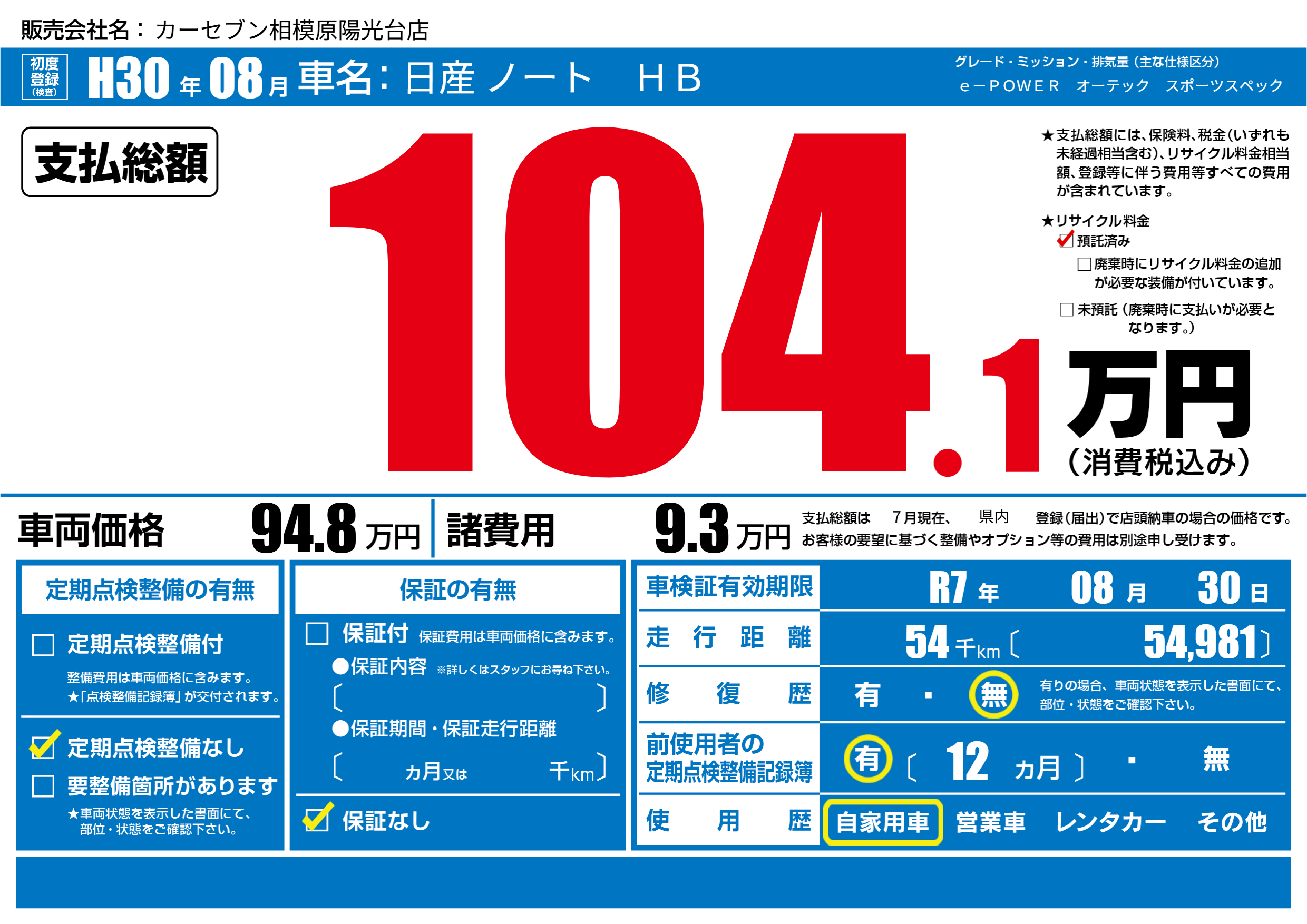 | 車検制限 | R7年 08月 30日 | ||