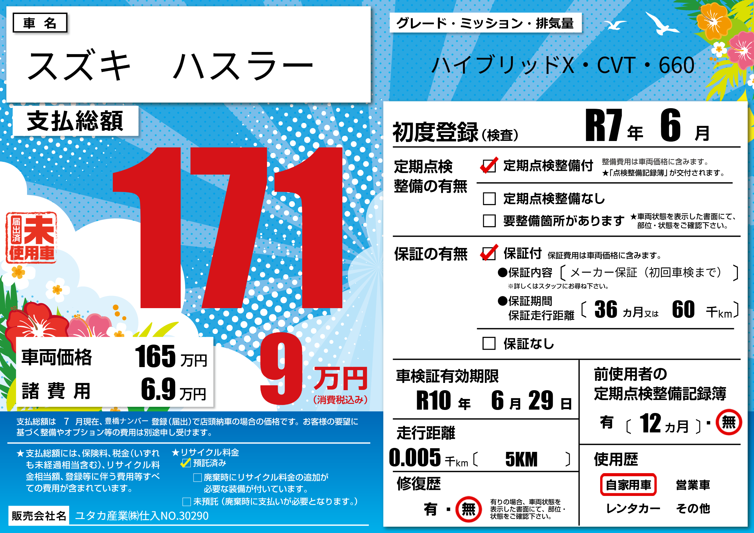 | 車名 | スズキ ハスラー | グレード ミッション 排気量 |