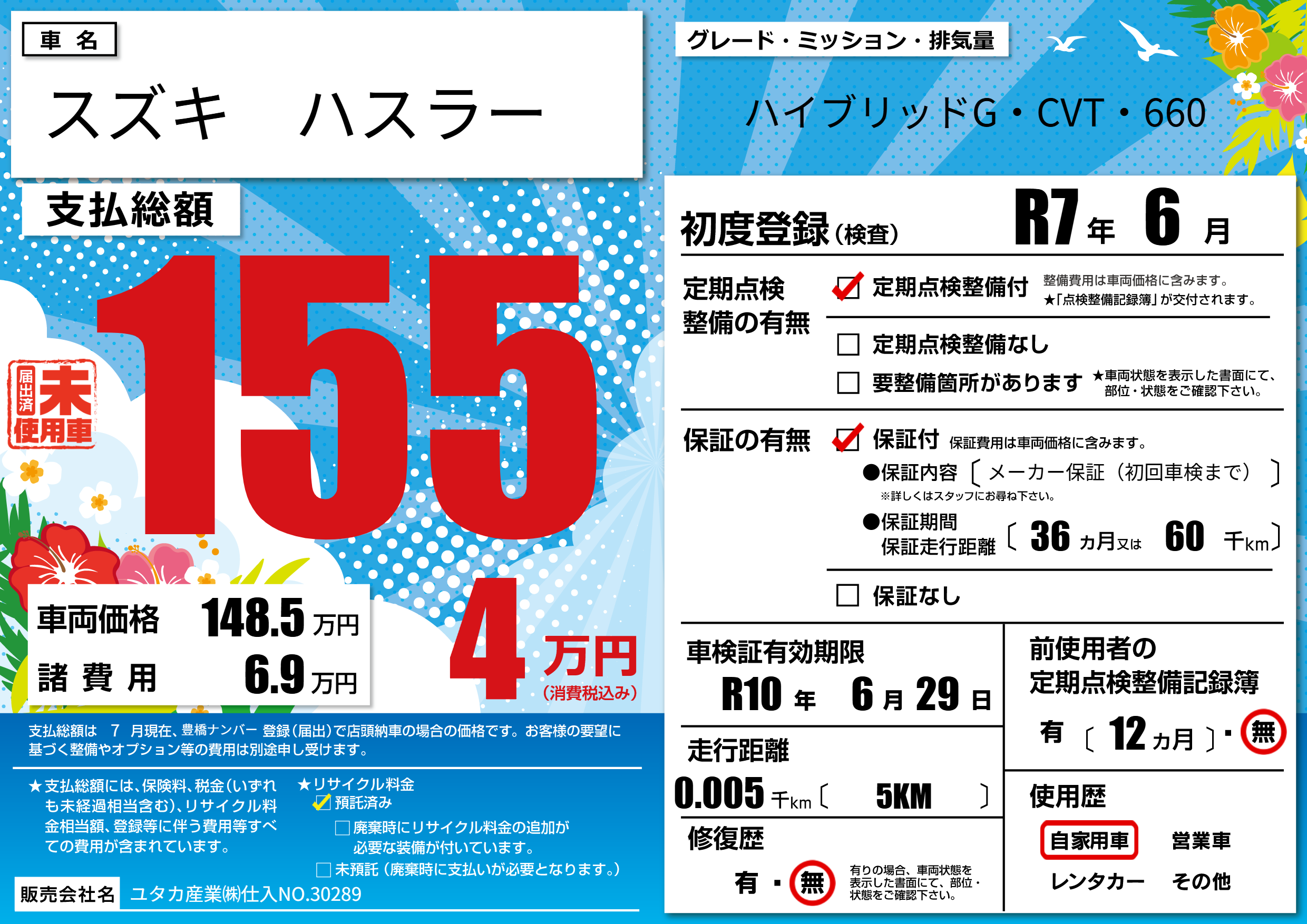 | 車名 | スズキ ハスラー | グレード ミッション 排気量 |