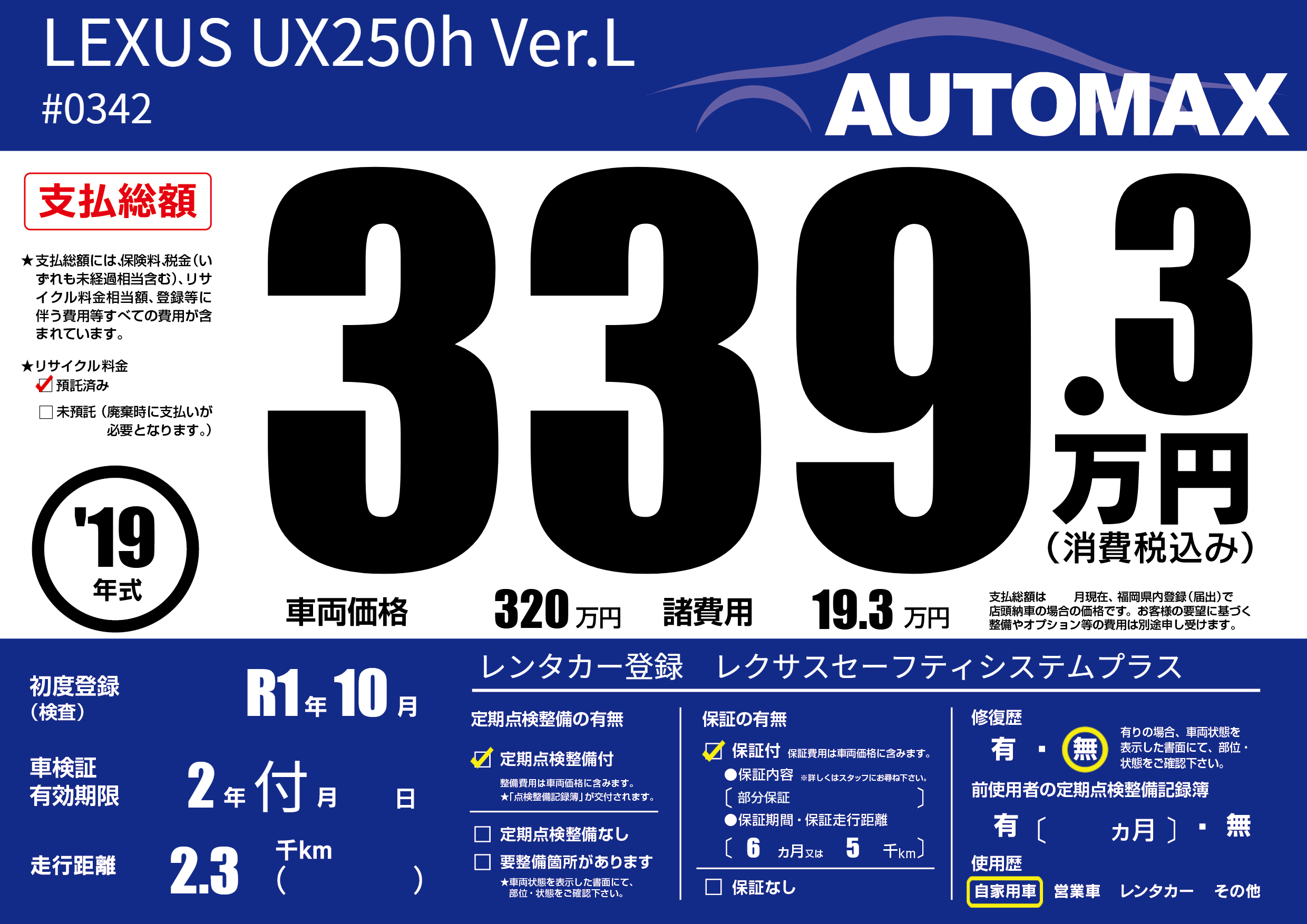 | 車名 | LEXUS UX250h Ver.L | グレード ミッション 排気量 |
