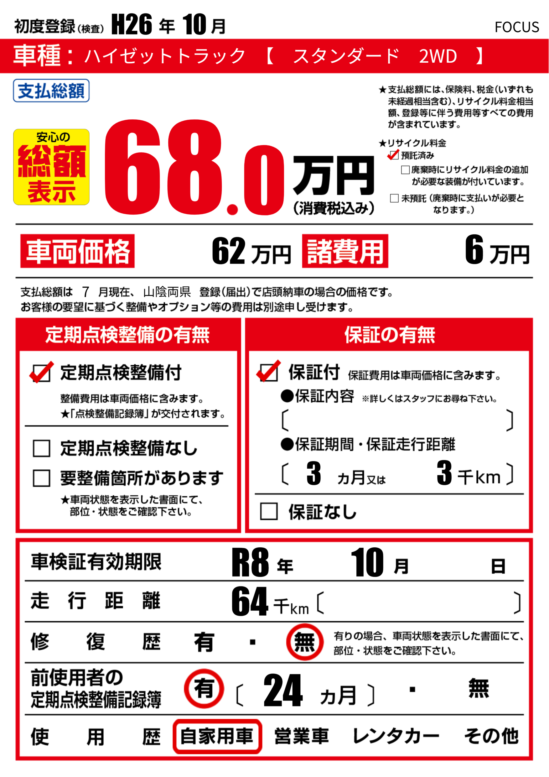 なし | 車検制限 | R8年10月---月 |