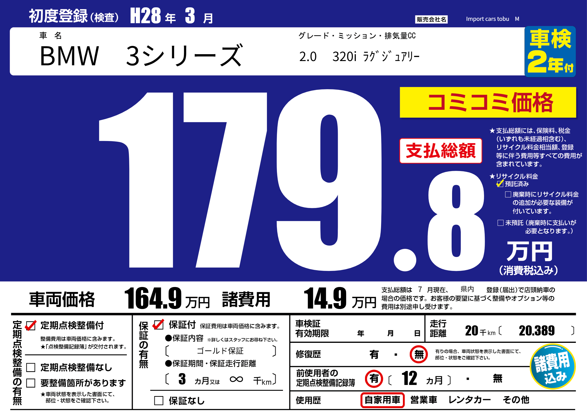 | 車名 | BMW 3シリーズ | グレード ミッション 排気量 |