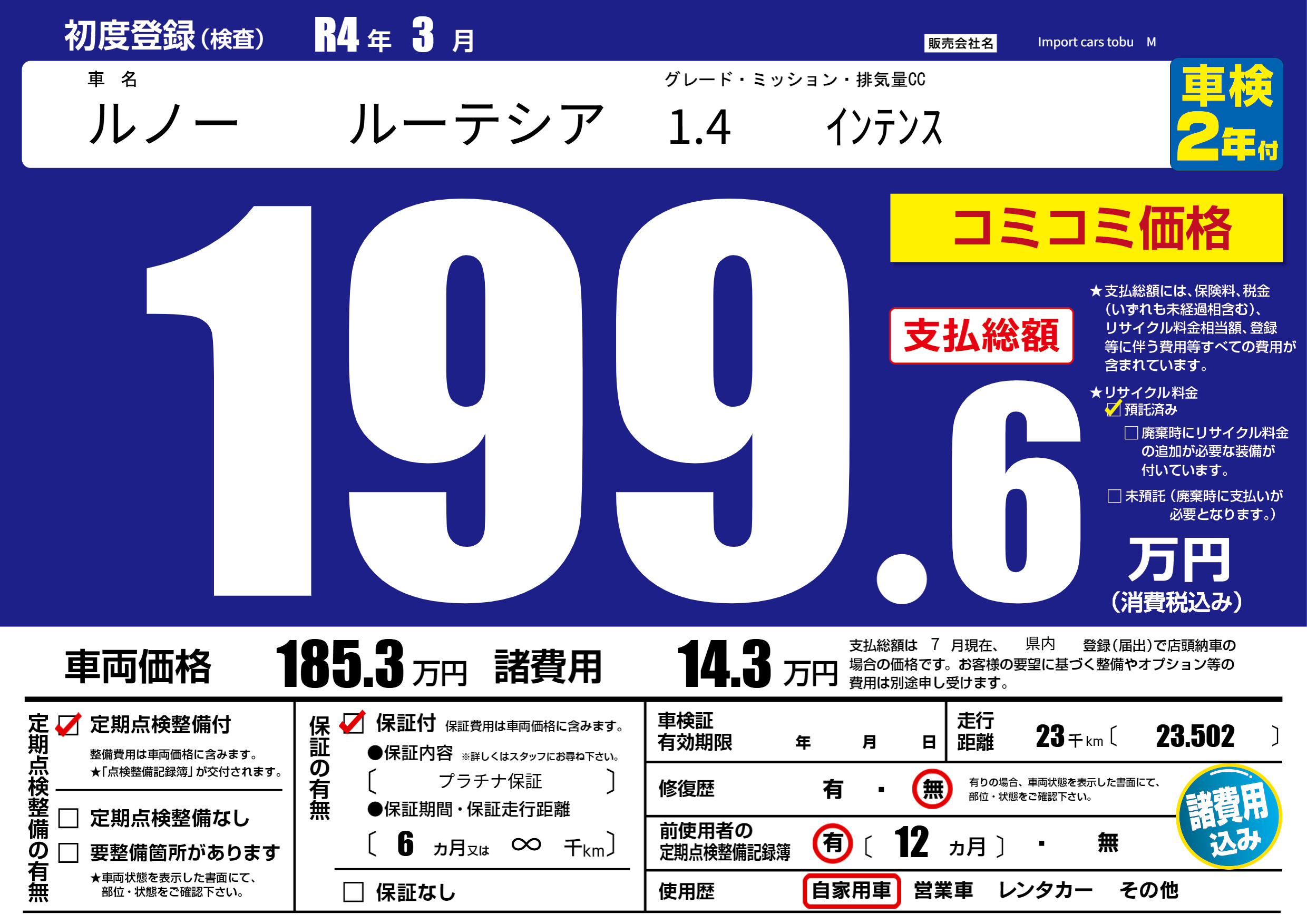 | 車名 | ルノー ルーテシア | グレード ミッション 排気量 |