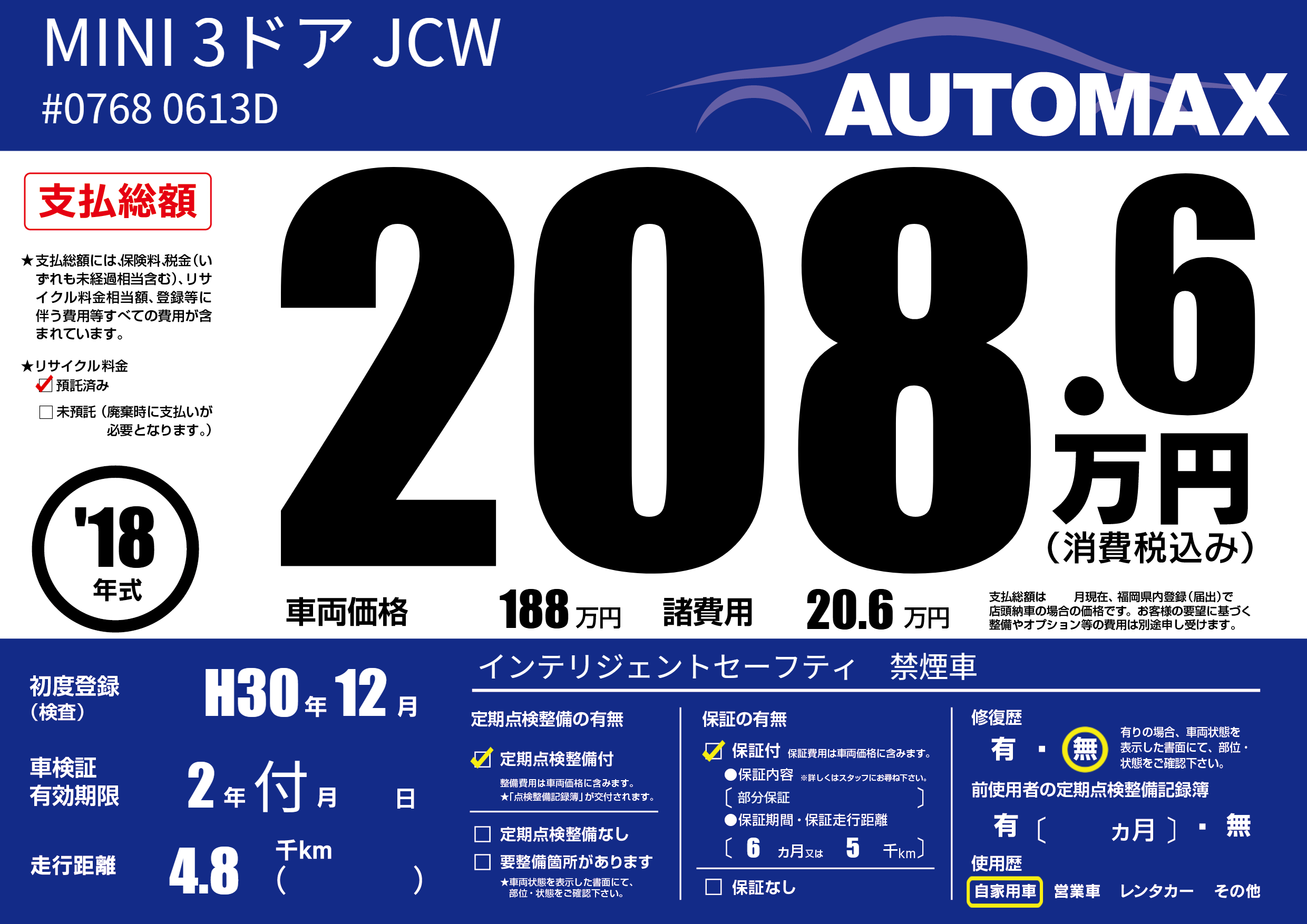 | 走行キロ | 0.4万km | 初年度登録 | H30年12月 |