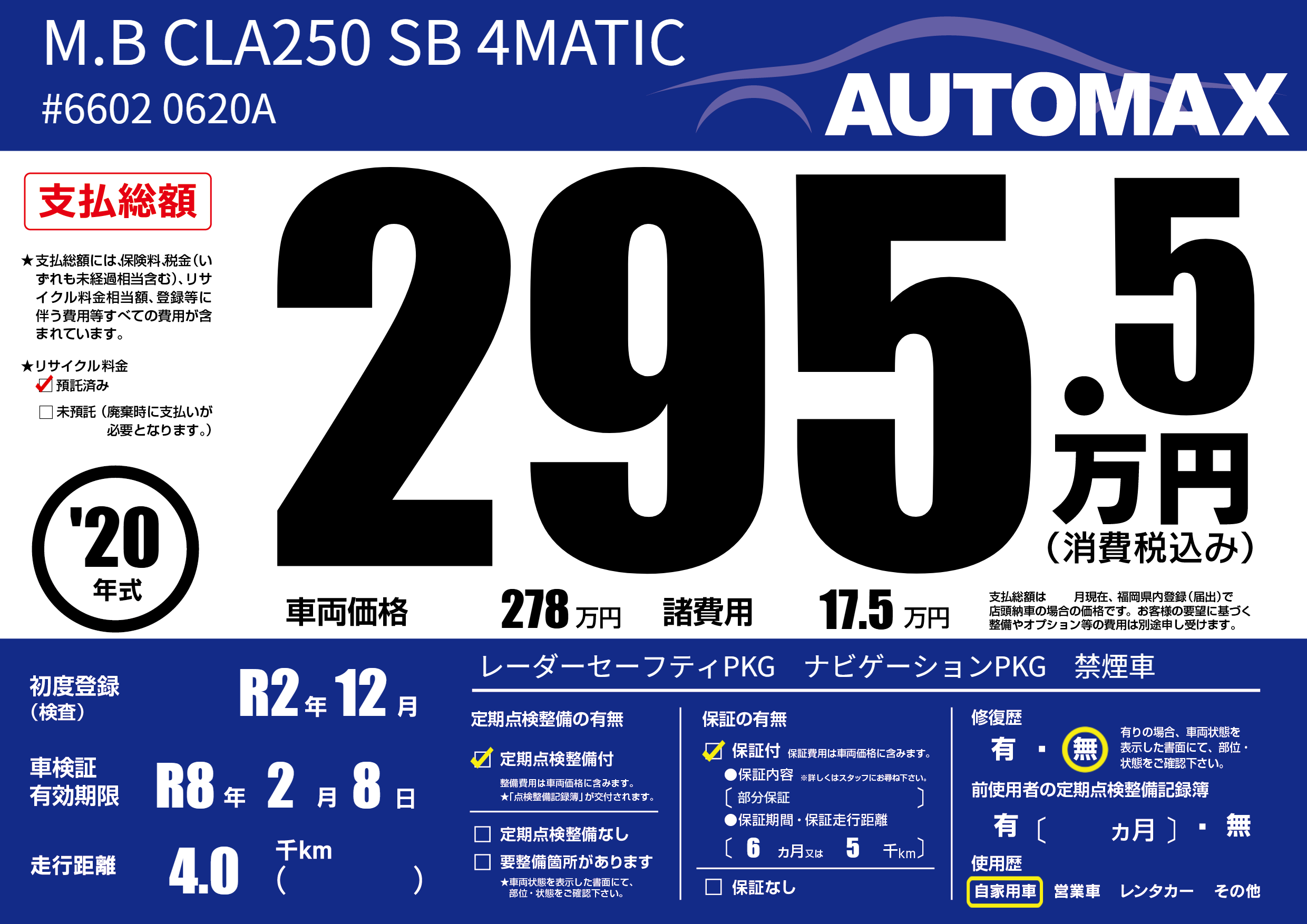 | 車名 | M.B CLA250 SB 4MATIC | グレード ミッション 排気量 |