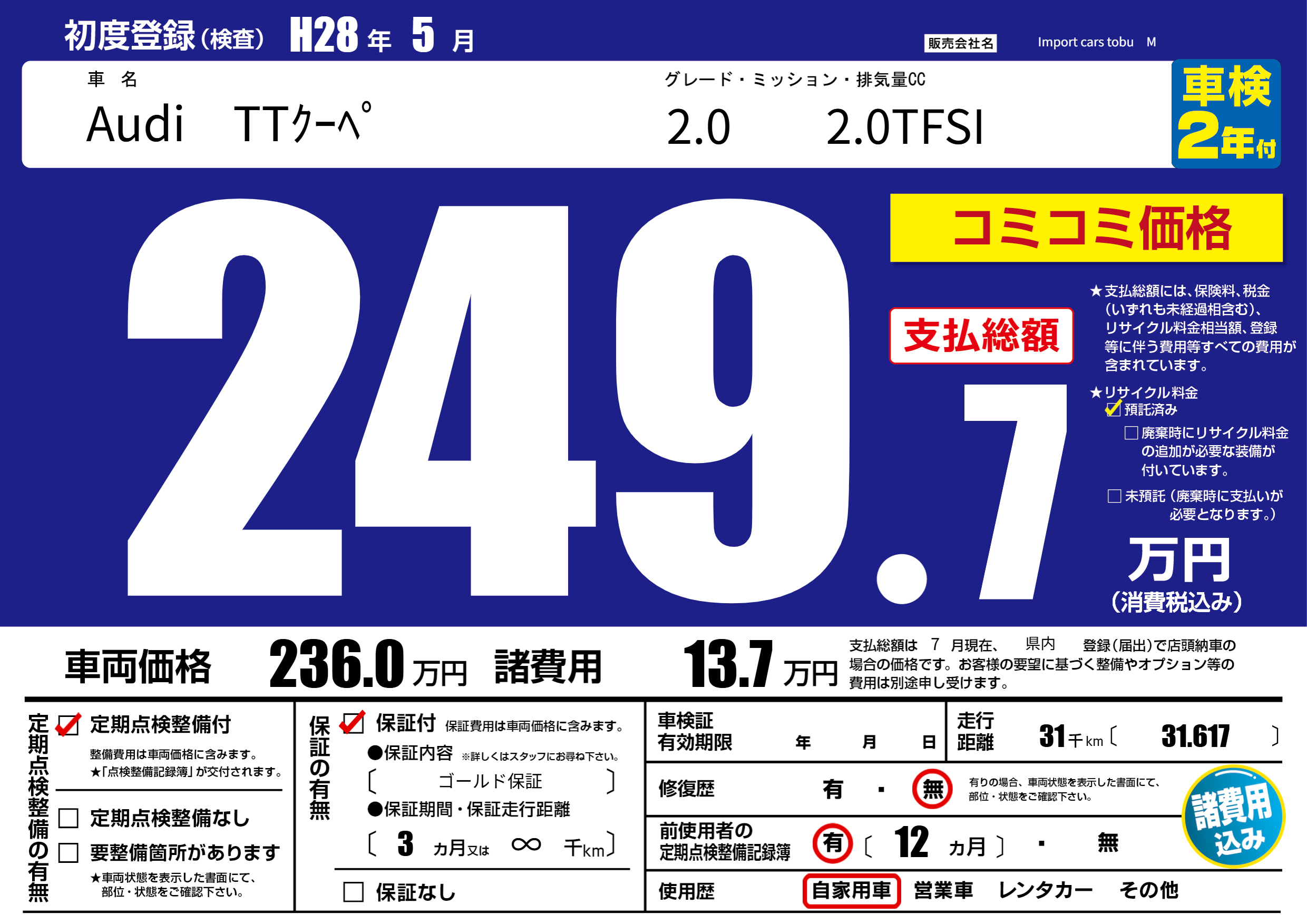| 車名 | Audi TTクーペ | グレード ミッション 排気量 |