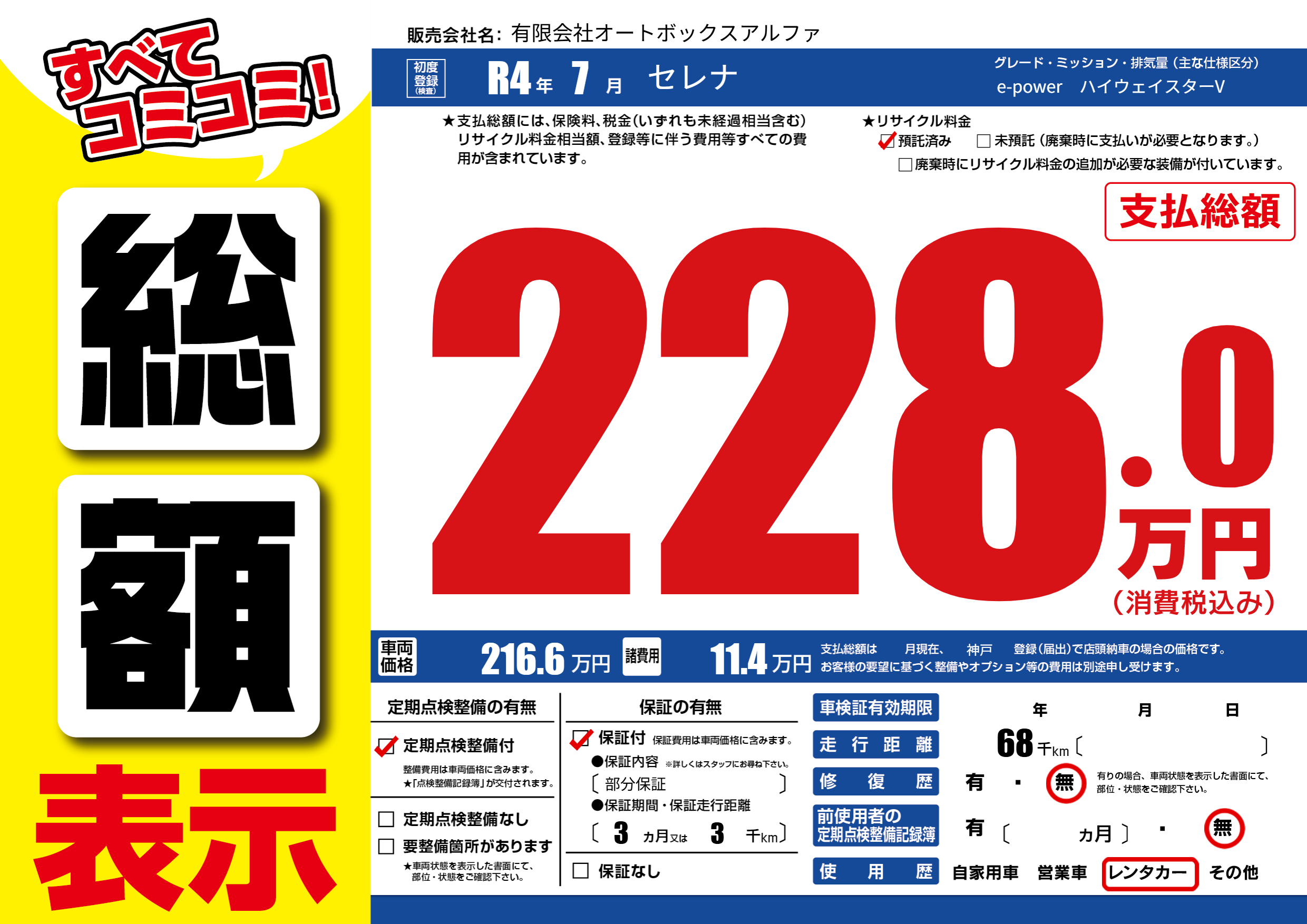 | 走行キロ | 6.8万km | 初年度登録 | R4年7月 |